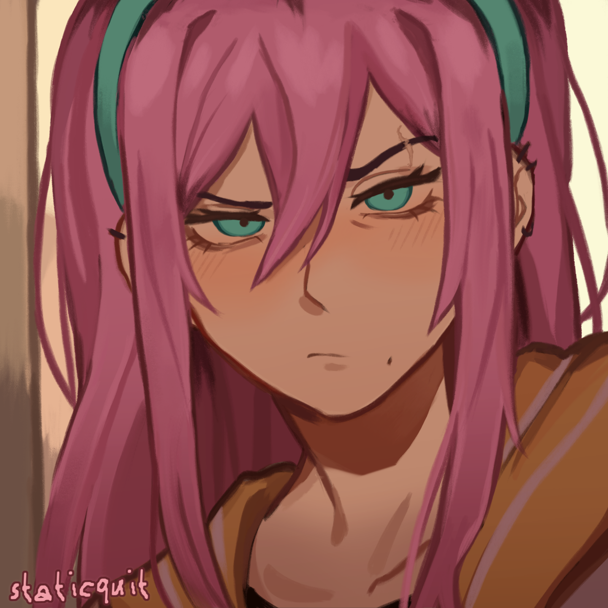1girl artist_name aubrey_(faraway)_(omori) aubrey_(omori) blue_eyes blue_hairband close-up closed_mouth collarbone ear_piercing hairband highres jacket long_hair looking_at_viewer mole mole_under_mouth omori piercing pink_hair solo staticquit upper_body white_jacket