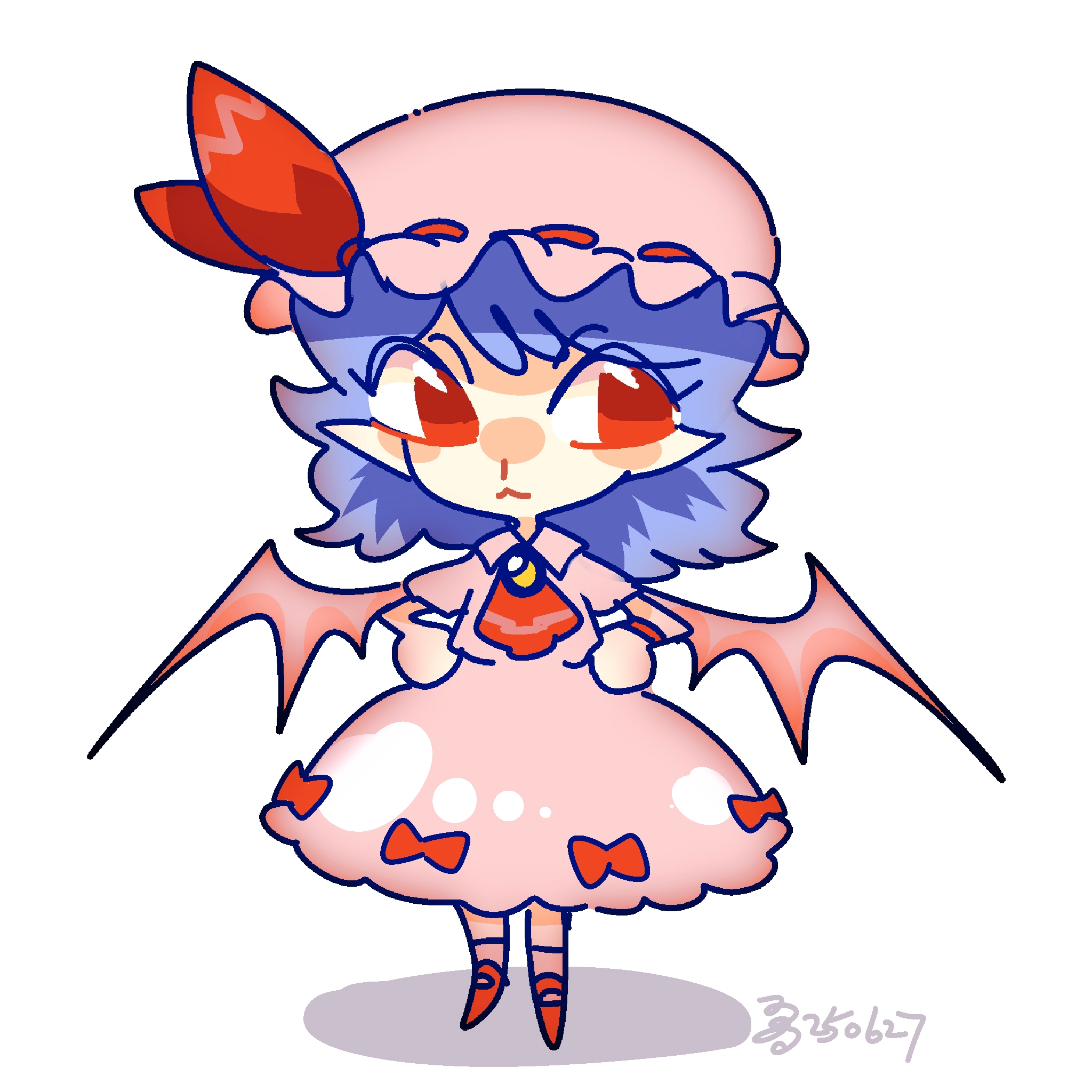 1girl ascot bat_wings blue_hair bow chibi dress full_body hat hat_ribbon highres looking_at_viewer mob_cap nailao pink_dress pointy_ears puffy_short_sleeves puffy_sleeves red_ascot red_eyes remilia_scarlet ribbon short_hair short_sleeves simple_background solo standing touhou white_background wings