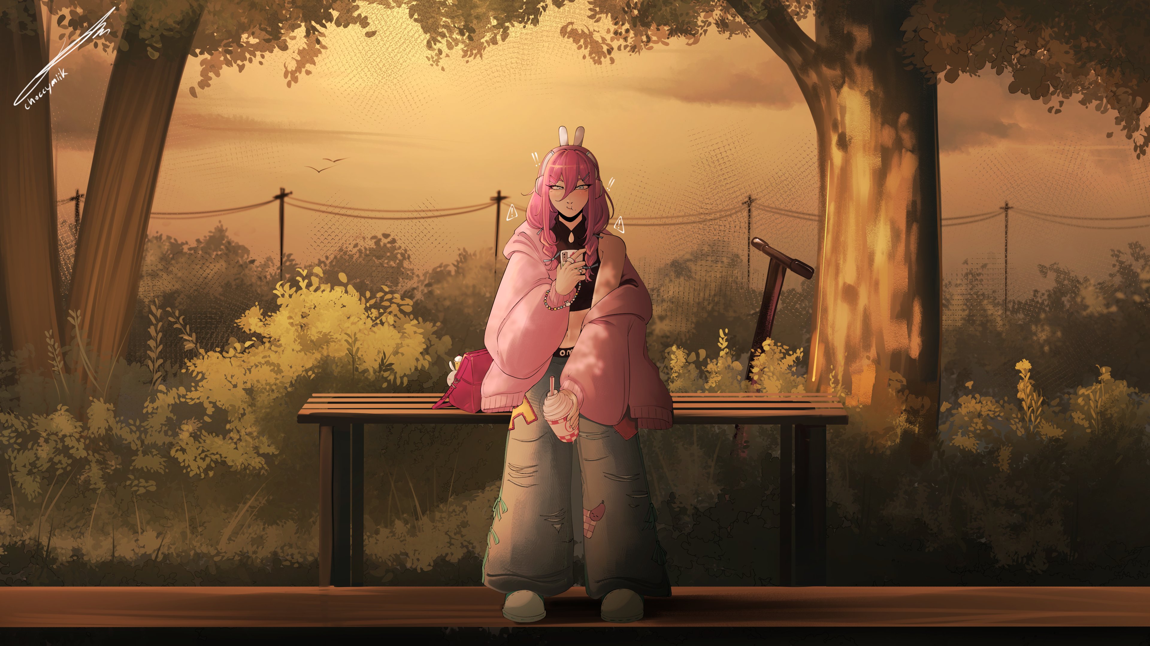 1girl absurdres animal_ear_headphones animal_ears aubrey_(birthday)_(omori) aubrey_(faraway)_(omori) aubrey_(omori) bag_charm bench blue_eyes braid cellphone charm_(object) choccymilk303 crop_top cup cupcake_bunny_(omori) denim drinking_straw fake_animal_ears full_body hair_ornament hairclip headphones highres holding holding_cup jacket jeans long_hair low_twin_braids motor_vehicle mr._plantegg_(omori) omori outdoors pants phone pink_hair pink_jacket power_lines rabbit_ear_headphones rabbit_ears scooter smartphone solo standing torn_clothes torn_jeans torn_pants twin_braids