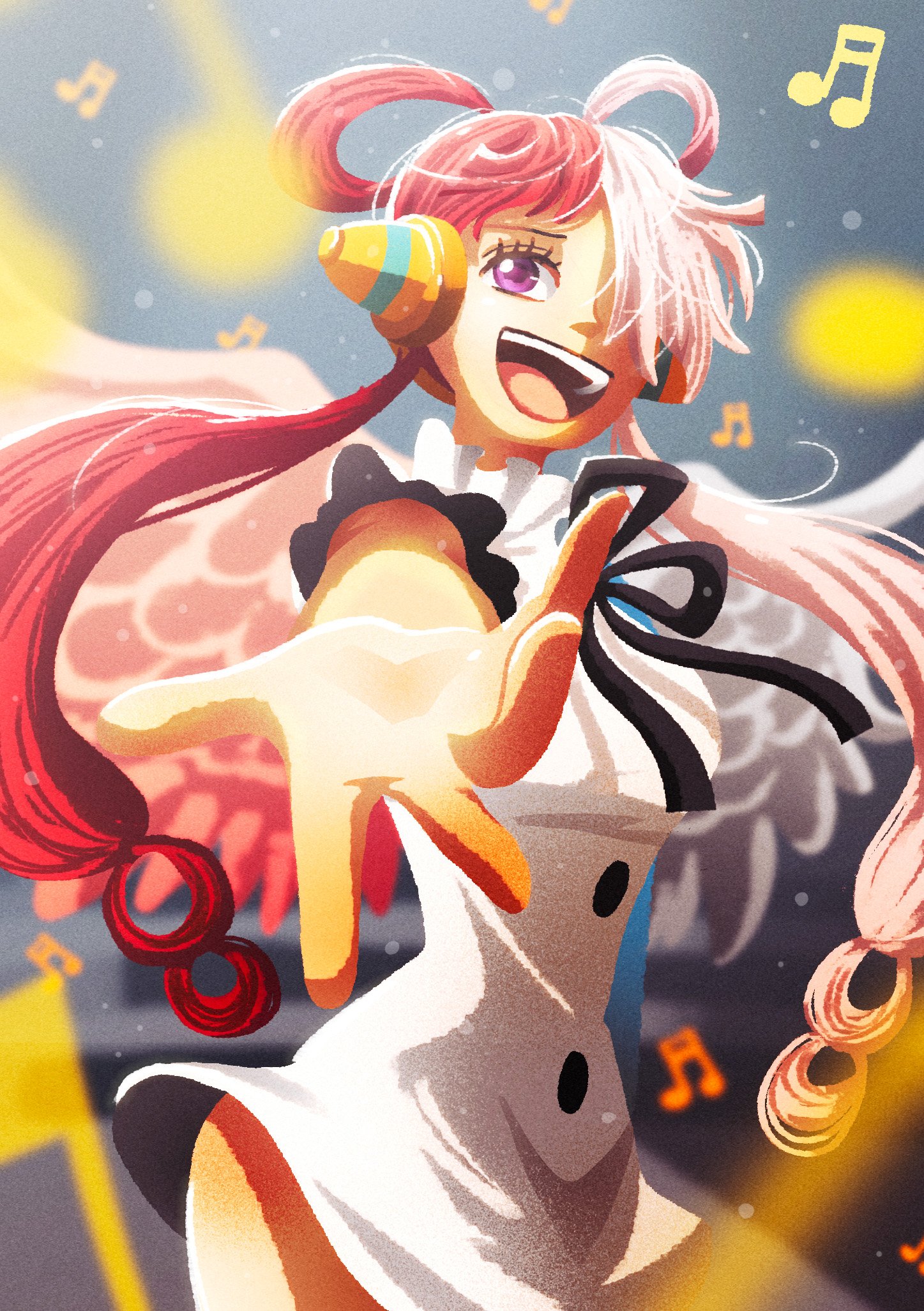 1girl blue_gloves commentary_request doccoi dress elbow_gloves eyelashes gloves headphones highres musical_note neck_ribbon one_piece one_piece_film:_red open_mouth pink_wings purple_eyes red_hair ribbon single_elbow_glove sleeveless smile solo teeth upper_teeth_only uta_(one_piece) white_dress white_hair white_wings wings