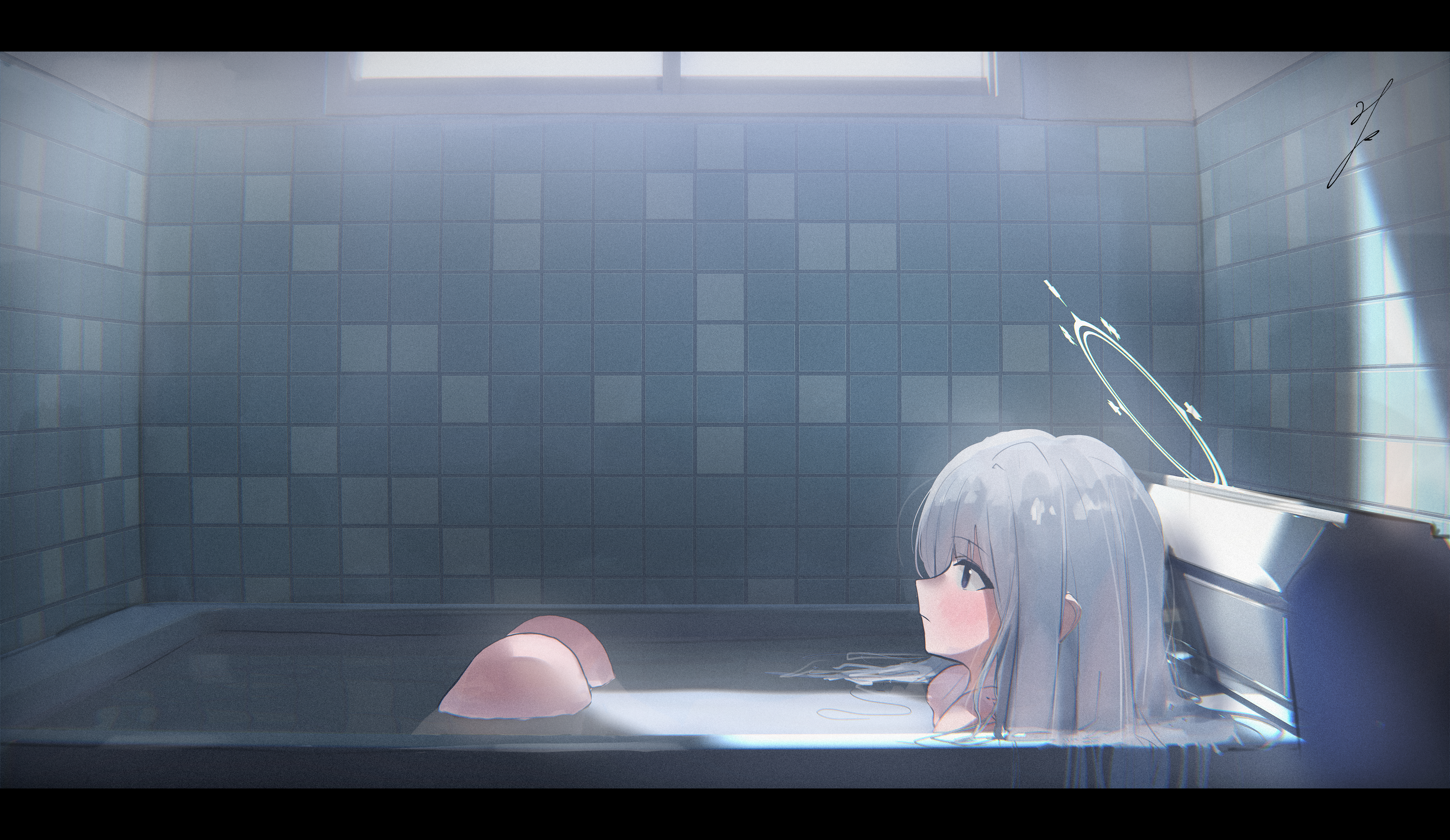 1girl absurdres bathroom blue_archive blush closed_mouth commentary from_side green_halo halo highres in_bathtub indoors knees_up letterboxed long_hair looking_ahead lying mirusen1x miyako_(blue_archive) partially_submerged profile signature solo sunlight tiles wet wet_hair white_hair