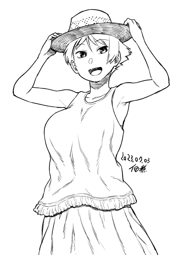 1girl :d armpits arms_up bare_shoulders black_eyes breasts collarbone dated hat holding large_breasts long_sidelocks looking_at_viewer open_mouth original shirt short_hair sidelocks signature simple_background skirt smile tongue tsukudani_(coke-buta) tsurime-chan very_short_hair white_background