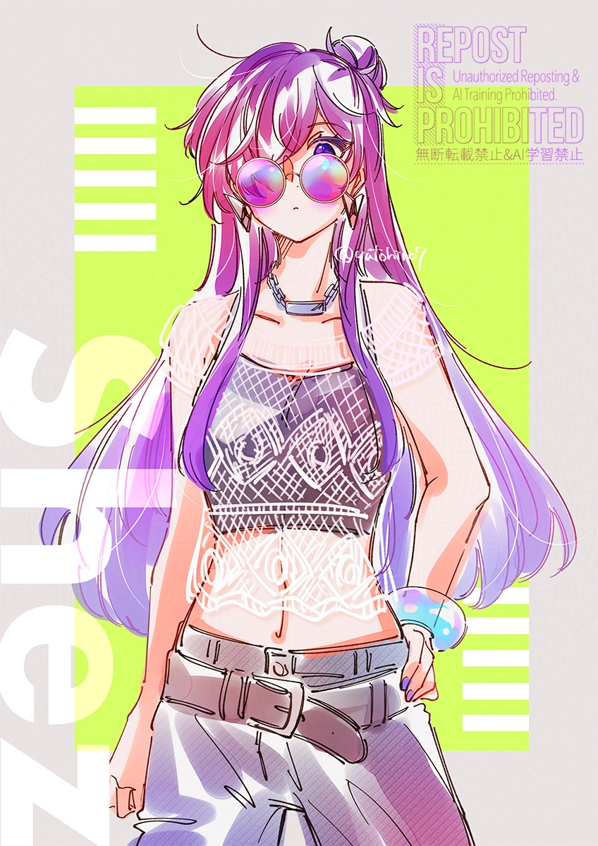 1girl belt breasts cleavage closed_mouth female_shez_(fire_emblem) fire_emblem fire_emblem:_three_houses fire_emblem_warriors:_three_hopes hair_bun hair_over_one_eye highres large_breasts long_hair looking_at_viewer medium_breasts nintendo purple_eyes purple_hair simple_background single_hair_bun smile solo sunglasses yutohiroya