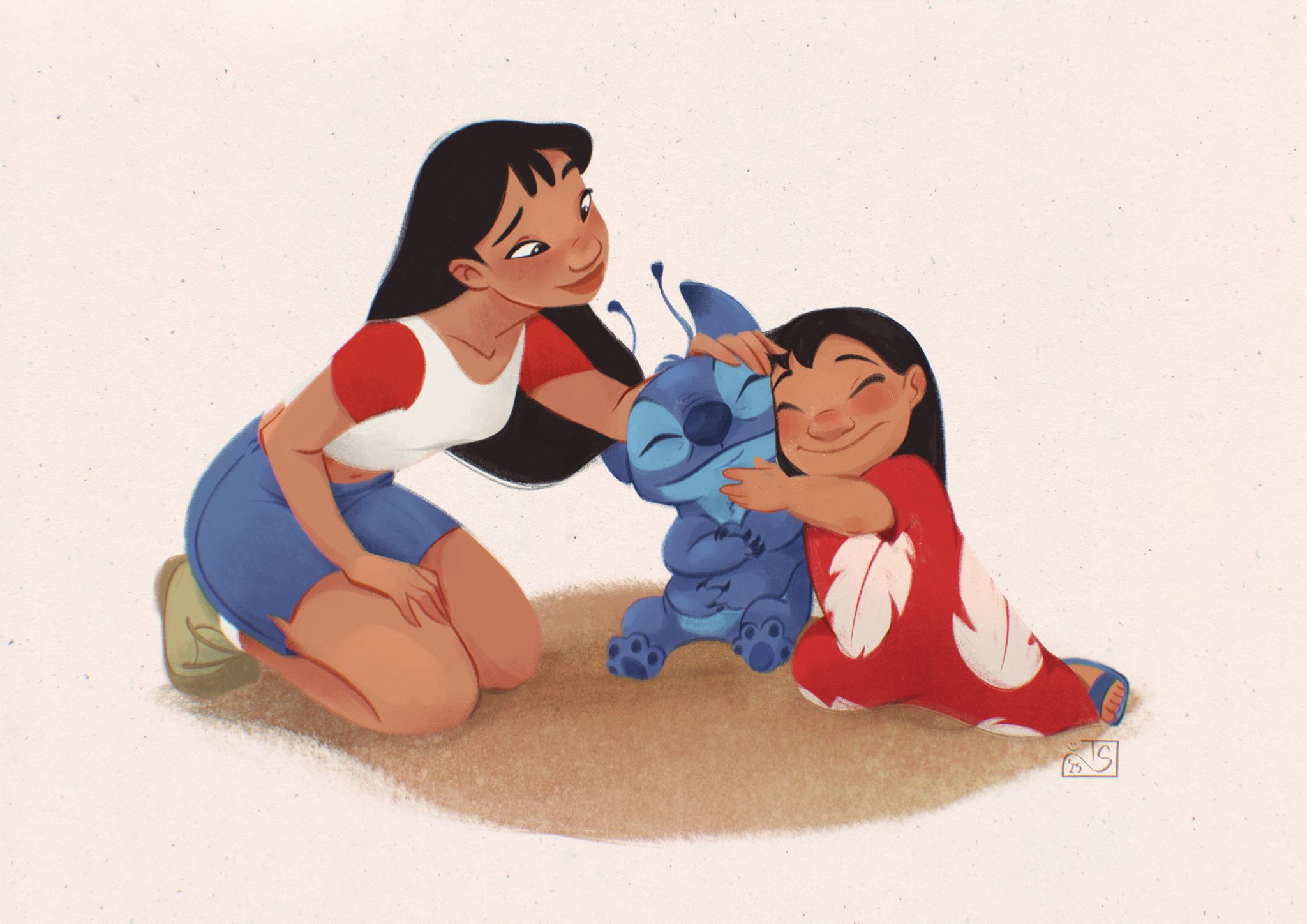 2girls antennae black_hair blue_fur blue_shorts blush closed_eyes dark-skinned_female dark_skin dress highres hug kneeling leaf_print lilo_&_stitch lilo_pelekai long_hair multiple_girls nani_pelekai print_dress red_dress red_sleeves shirt short_shorts short_sleeves shorts siblings sisters stitch_(lilo_&_stitch) tanisketch white_shirt