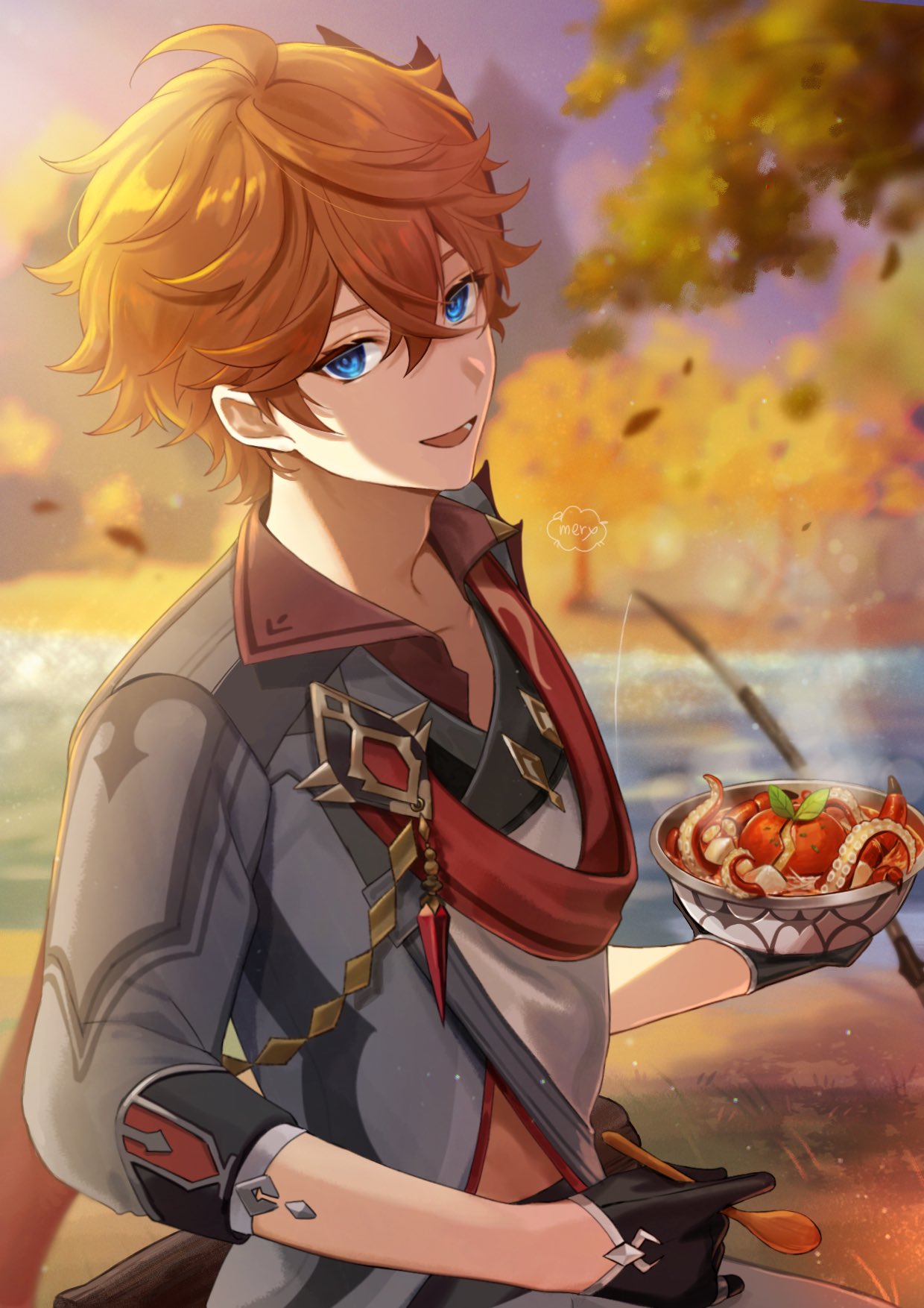 1boy :d ahoge artist_name black_gloves blue_eyes bowl brown_hair commentary_request fishing_rod food genshin_impact gloves grey_shirt hair_between_eyes highres hitsujino_mery holding holding_bowl holding_spoon lake male_focus open_mouth purple_sky shirt sky smile solo spoon tartaglia_(genshin_impact) tree water