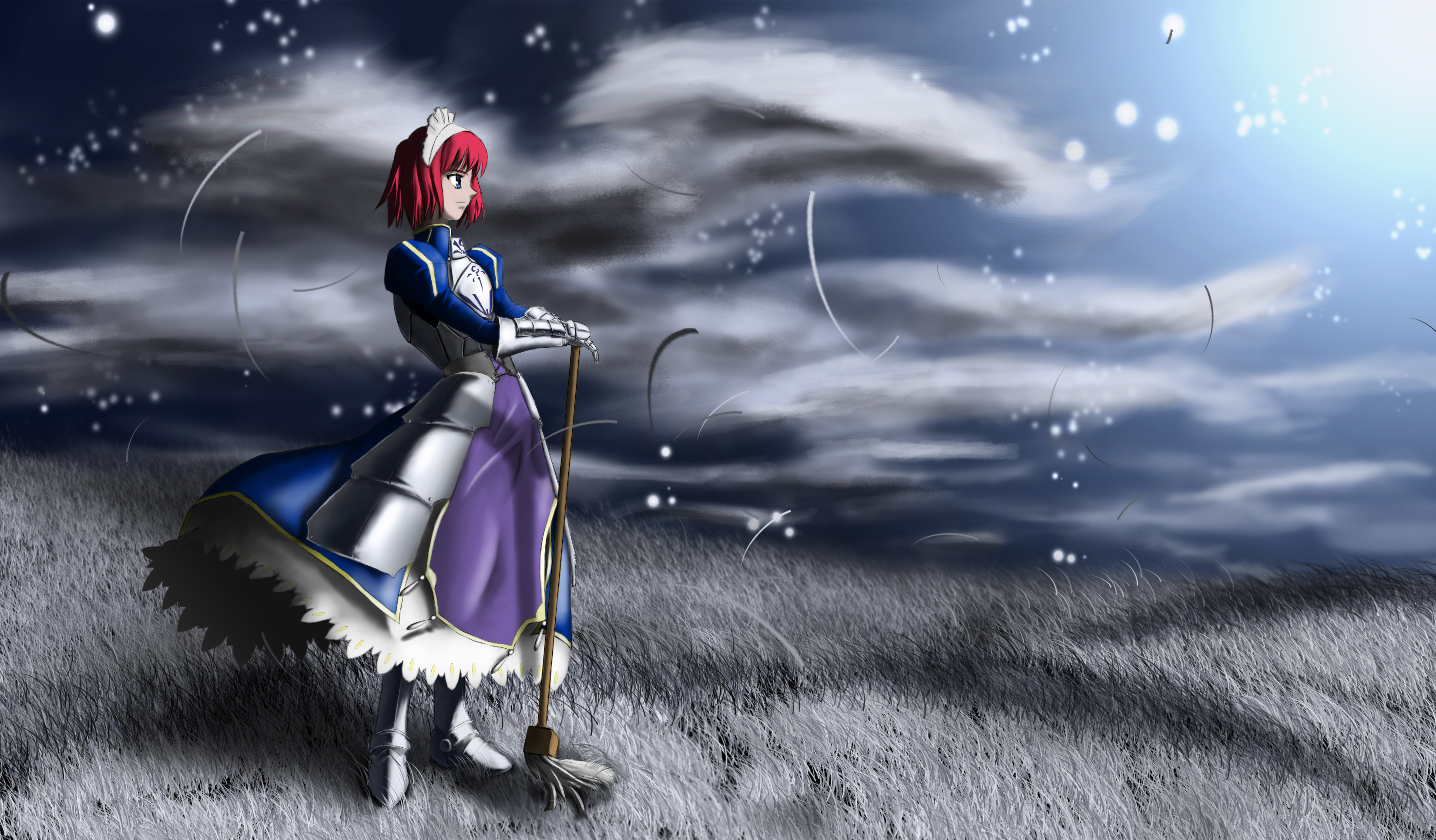 1girl absurdres armor armored_dress artoria_pendragon_(fate) blue_eyes cloud cloudy_sky cosplay dress fate/stay_night fate_(series) field gauntlets highres hisui_(tsukihime) holding holding_mop kuroi-kenshi long_sleeves maid mop red_hair saber_(fate) saber_(fate)_(cosplay) short_hair sky solo tsukihime type-moon wind