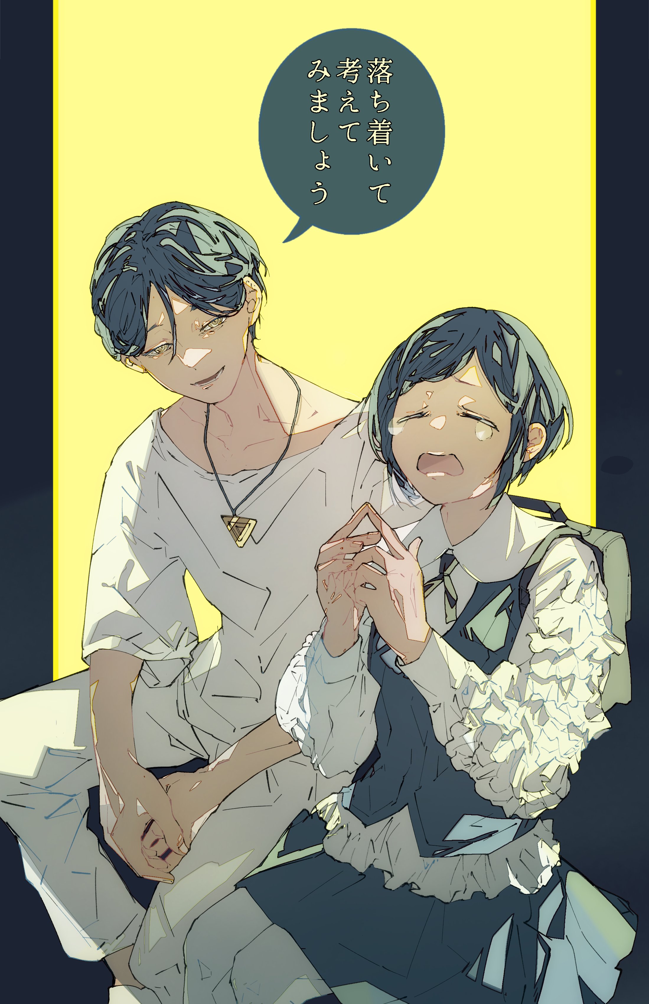 1boy 1girl absurdres backpack bag blue_hair blue_skirt closed_eyes collared_shirt commentary crying frilled_shirt frills fukurai_azami hashtag-only_commentary highres limited_palette long_sleeves looking_at_another meguriya_ayumu open_mouth own_hands_together pants pantyhose puffy_long_sleeves puffy_sleeves shikishima_(3jikaika) shirt short_hair sitting skirt smile speech_bubble toshi_densetsu_kaitai_center translation_request triangle_necklace white_pants white_pantyhose white_shirt yellow_eyes
