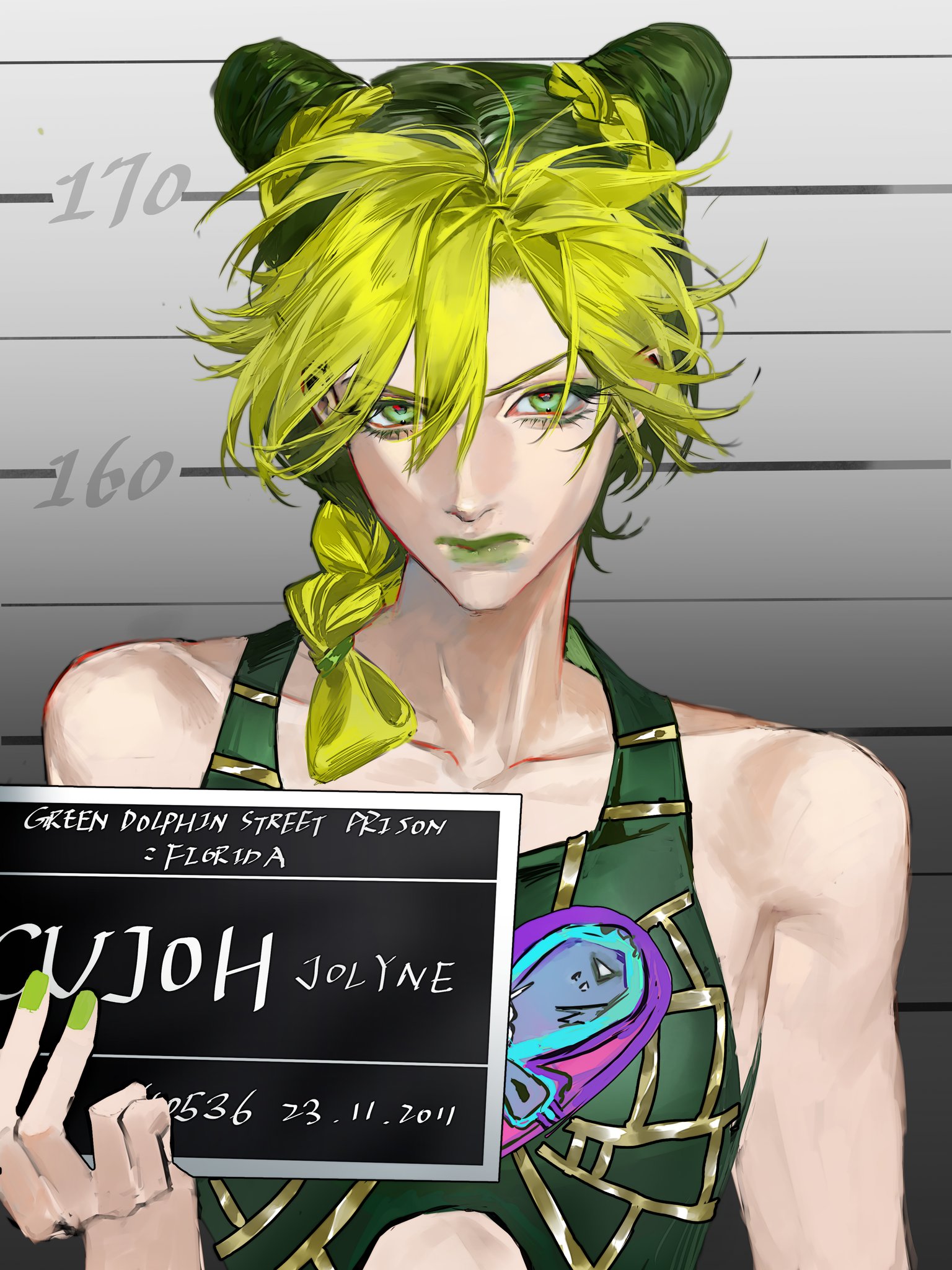 1girl bare_shoulders braid braided_ponytail character_name closed_mouth collarbone commentary_request cone_hair_bun double_bun godi41mings green_eyes green_hair green_lips green_nails green_tank_top hair_between_eyes hair_bun height_chart highres holding holding_sign indoors jojo_no_kimyou_na_bouken kuujou_jolyne looking_at_viewer makeup multicolored_hair sign solo spider_web_print stone_ocean tank_top two-tone_hair upper_body