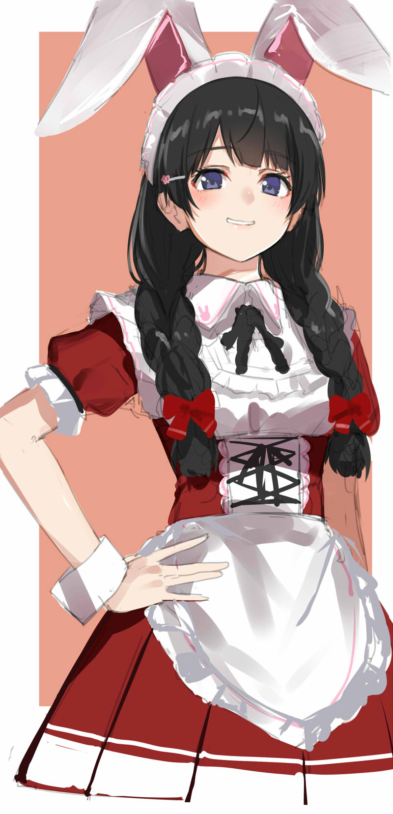 1girl animal_ear_hairband animal_ears apron black_hair bow braid dress fake_animal_ears hair_bow hair_ornament hairband hairclip hand_on_own_hip highres isshiki_(ffmania7) long_hair looking_at_viewer nijisanji puffy_short_sleeves puffy_sleeves purple_eyes rabbit_ear_hairband rabbit_ears red_dress short_sleeves smile solo tsukino_mito tsukino_mito_(maid) twin_braids virtual_youtuber waitress white_apron wrist_cuffs