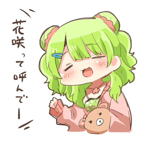 1girl :d blush_stickers camisole chibi closed_eyes cropped_torso double_bun green_camisole green_hair hair_bun jacket long_sleeves lowres morinaka_kazaki morinaka_kazaki_(2nd_costume) nijisanji off_shoulder open_clothes open_jacket open_mouth pink_jacket polka_dot_camisole puffy_long_sleeves puffy_sleeves rebecca_(keinelove) simple_background sleeves_past_wrists smile solo stuffed_animal stuffed_toy teddy_bear translation_request upper_body virtual_youtuber white_background