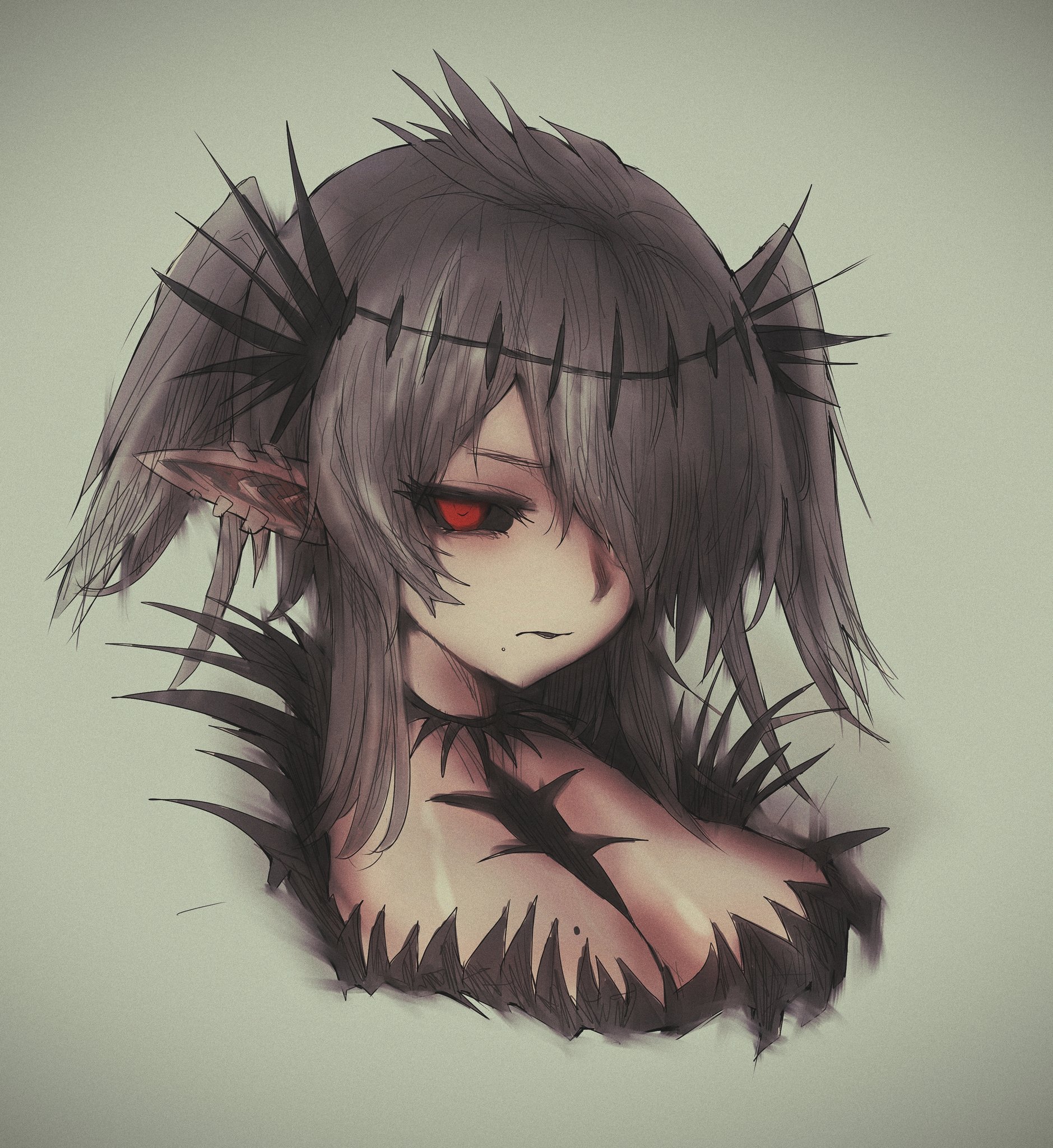 1girl black_collar black_lips black_sclera black_skirt black_souls black_souls_2 black_wings breasts cleavage closed_mouth collar color_filter colored_sclera courtisane_(black_souls) ear_piercing green_background grey_hair hair_ornament hair_over_eyes hair_over_one_eye head_wings highres looking_at_viewer medium_hair mole mole_on_breast mole_under_mouth nose piercing pointy_ears red_eyes short_twintails sidelocks simple_background skirt solo twintails wings wrangelina