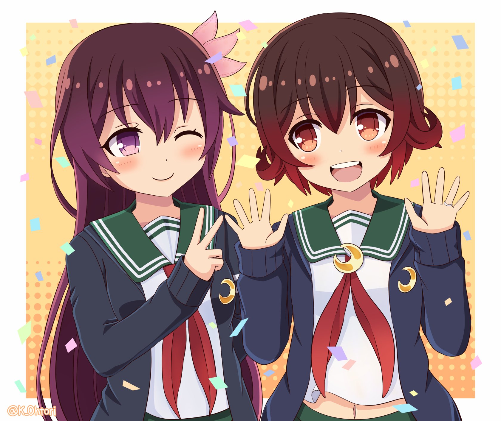 2girls blue_jacket blush brown_hair closed_eyes crescent crescent_pin gradient_hair green_sailor_collar green_skirt highres jacket jewelry kantai_collection kisaragi_(kancolle) kisaragi_kai_ni_(kancolle) long_hair long_sleeves multicolored_hair multiple_girls mutsuki_(kancolle) mutsuki_kai_ni_(kancolle) neckerchief one_eye_closed ootori_(kyoya-ohtori) open_mouth pantyhose pleated_skirt purple_eyes red_hair red_neckerchief ring sailor_collar school_uniform serafuku short_hair skirt smile upper_body v wedding_ring white_background yellow_background