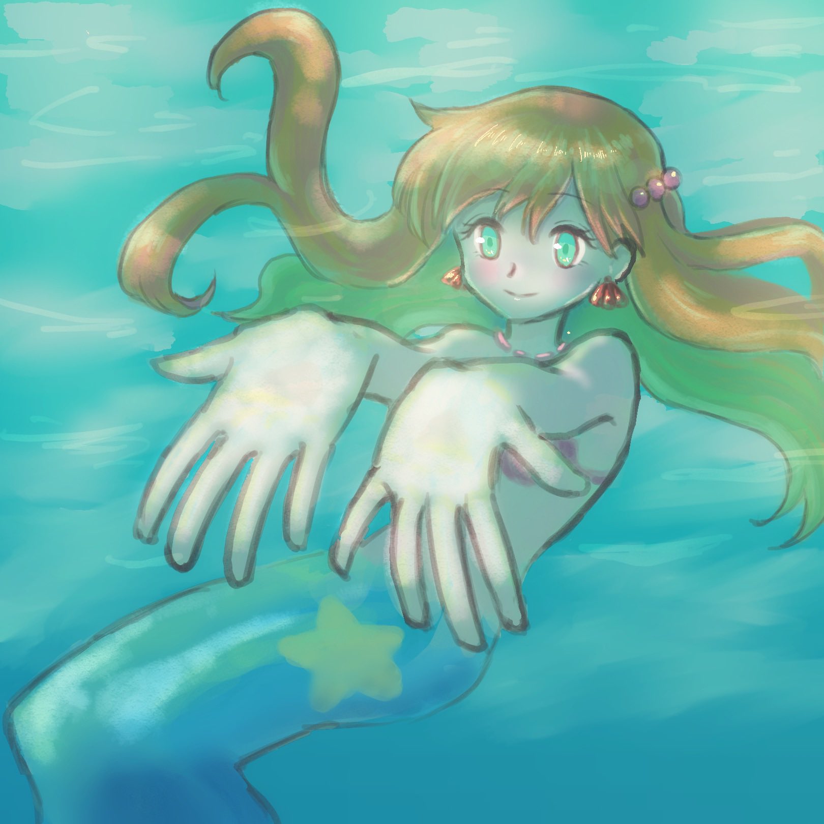 1girl bikini blush breasts bubble earrings gen_1_pokemon green_eyes hair_ornament highres jewelry legs long_hair mermaid mermaid_misty_(pokemon) misty_(pokemon) monster_girl monsterification necklace nintendo nude orange_hair pokemon pokemon_(anime) pokemon_(classic_anime) pokemon_red/green/blue/yellow rickey3794 seashell shell shell_bikini smile solo swimsuit underwater water