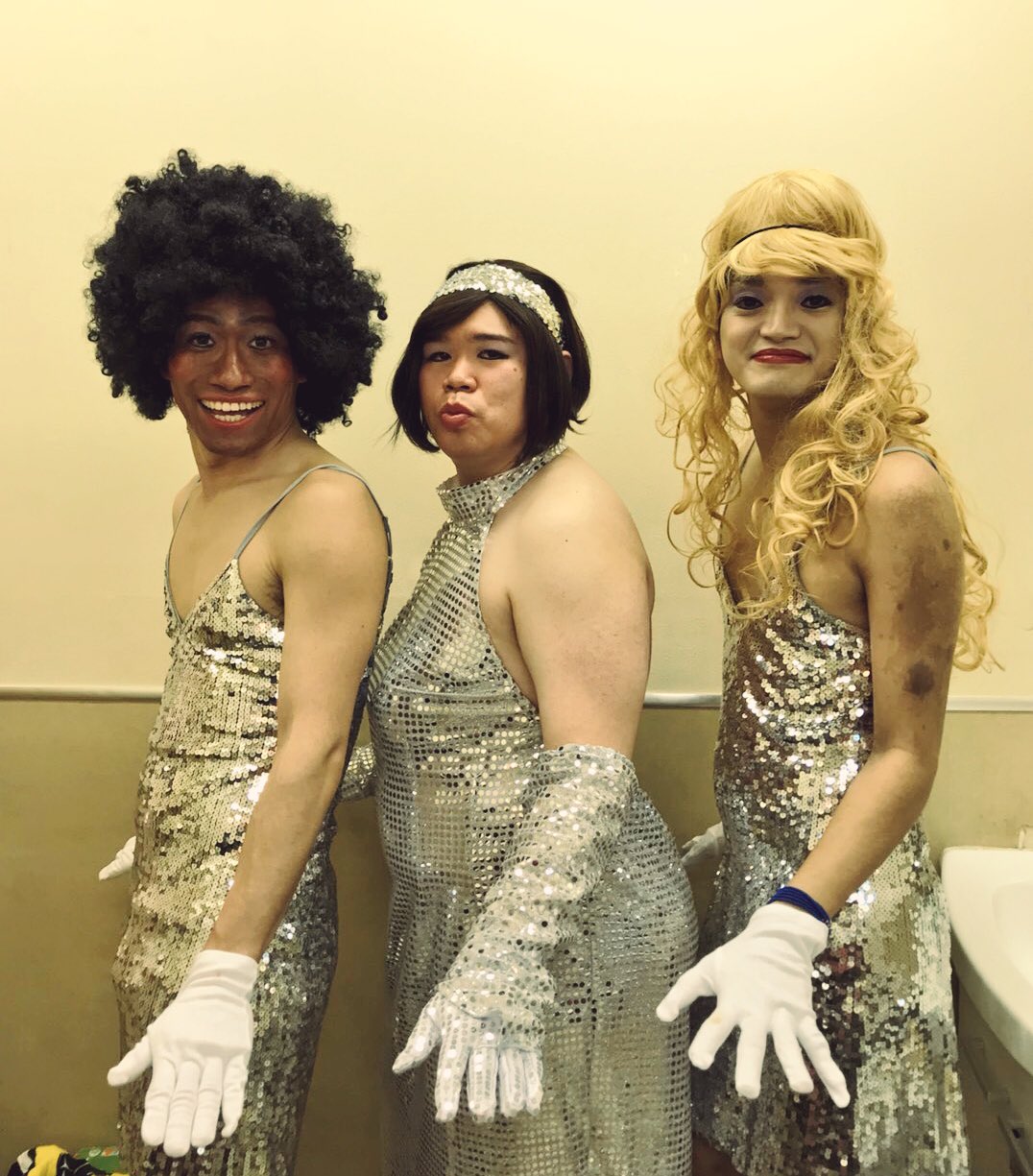 3boys black_hair blonde_hair brown_eyes cosplay dress elbow_gloves ganguro gloves gyaru halter_dress halterneck highres margaret_camellia_yazima multiple_boys naomi_camellia_yazima photo_(medium) sequins strawberry_camellia_yazima white_gloves yazima_beauty_salon