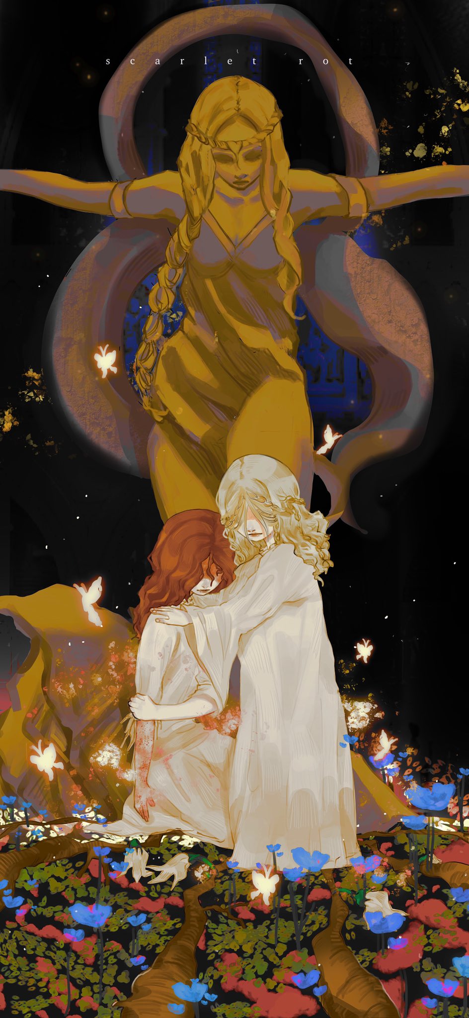 1boy 1girl barefoot blonde_hair brother_and_sister bug butterfly daylovemail dress elden_ring english_text flower hair_over_eyes highres hug insect long_hair malenia_blade_of_miquella miquella_(elden_ring) queen_marika_the_eternal red_hair siblings statue twins very_long_hair wavy_hair white_dress wide_sleeves