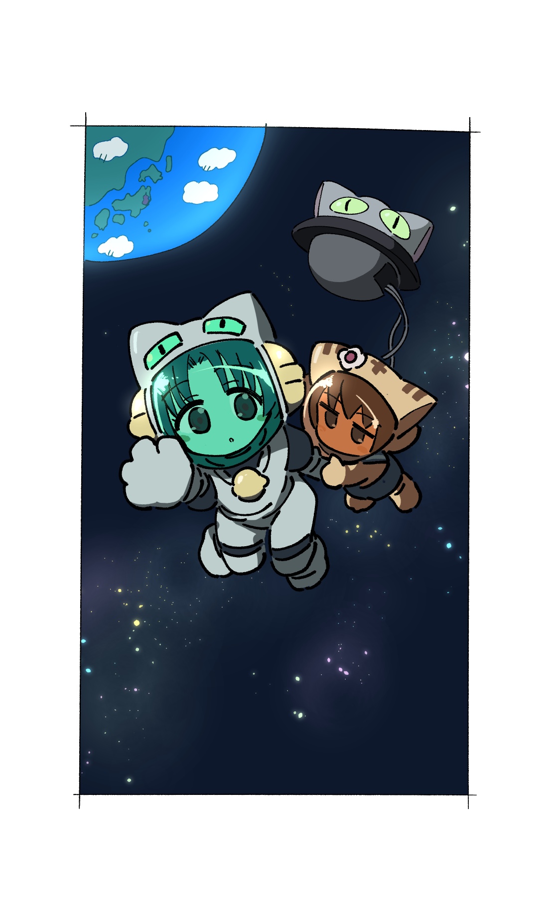 2girls animal_hat anzu_yoshihiro astronaut bell border brown_hair cat_hat chibi dejiko di_gi_charat earth_(planet) full_body hat highres holding_hands jitome multiple_girls neck_bell open_mouth planet puchiko space star_(sky) ufo white_border