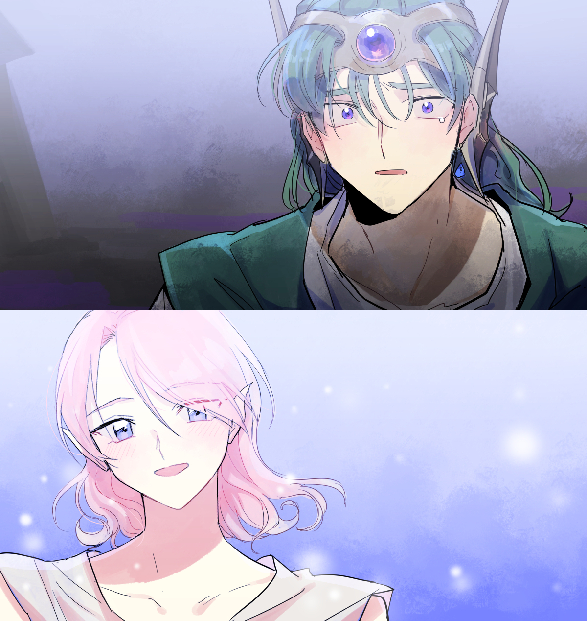 1boy 1girl aqua_tunic blue_eyes blue_gem collarbone commentary_request cynthia_(dq4) dragon_quest dragon_quest_iv earrings fins floating_hair forehead_protector fukusuu_(zeonms_06s) gem gradient_background green_hair head_fins hero_(dq4) highres jewelry looking_at_another looking_at_viewer medium_hair open_mouth partial_commentary pink_hair pointy_ears portrait shirt single_earring single_tear split_screen tunic upper_body white_shirt wide-eyed