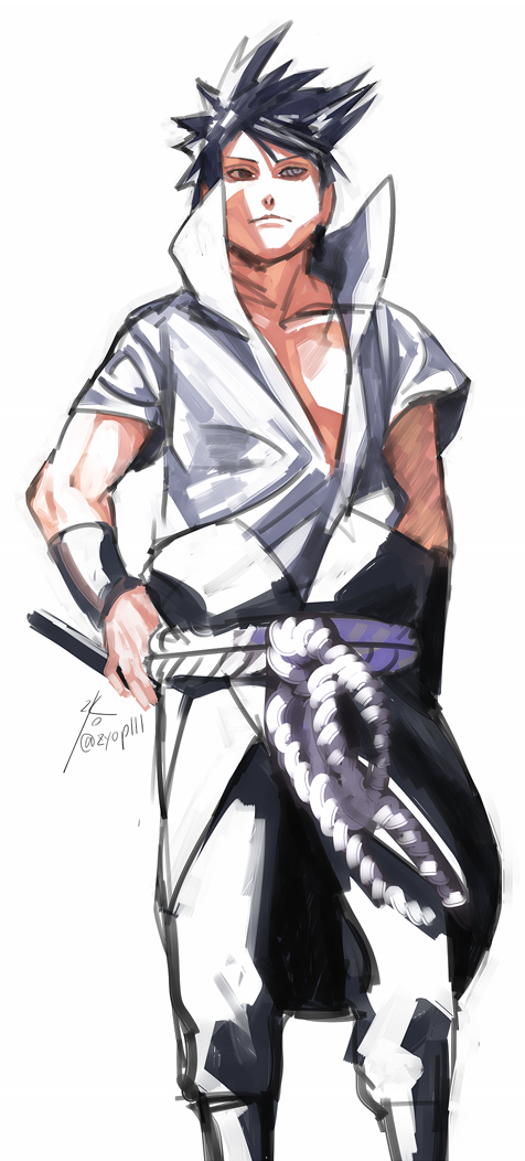 1boy black_hair black_pants closed_mouth grey_shirt heterochromia male_focus naruto_(series) naruto_shippuuden ninja pants red_eyes rinnegan sharingan shirt short_hair simple_background smile solo spiked_hair uchiha_sasuke white_background zifletts