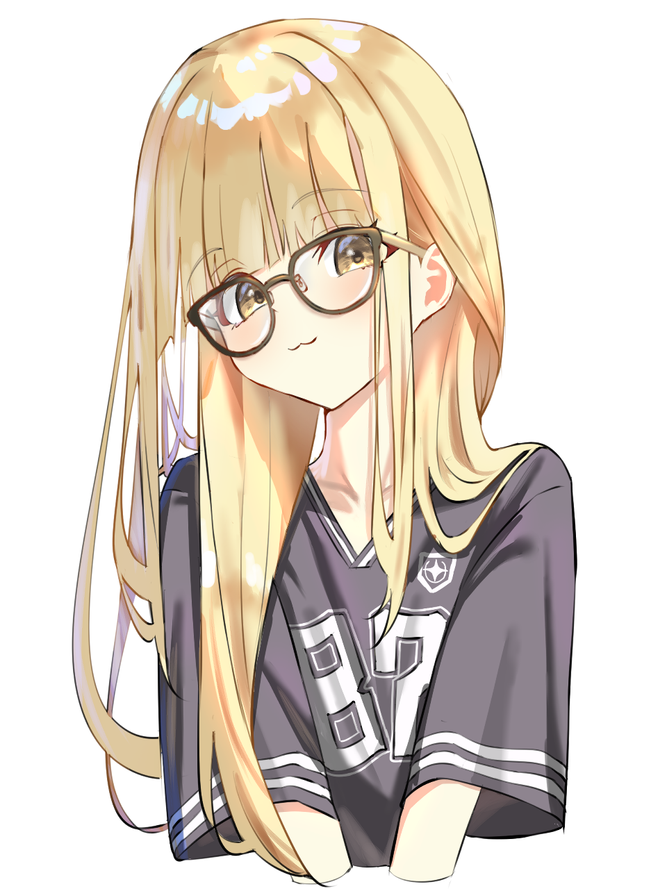 1girl :3 black_shirt blonde_hair blunt_bangs blush brown-framed_eyewear collarbone commentary_request cropped_arms cropped_torso fujita_kotone gakuen_idolmaster glasses highres idolmaster long_hair looking_at_viewer macchi_(gduv5257) shirt simple_background solo straight_hair upper_body v-neck very_long_hair white_background yellow_eyes