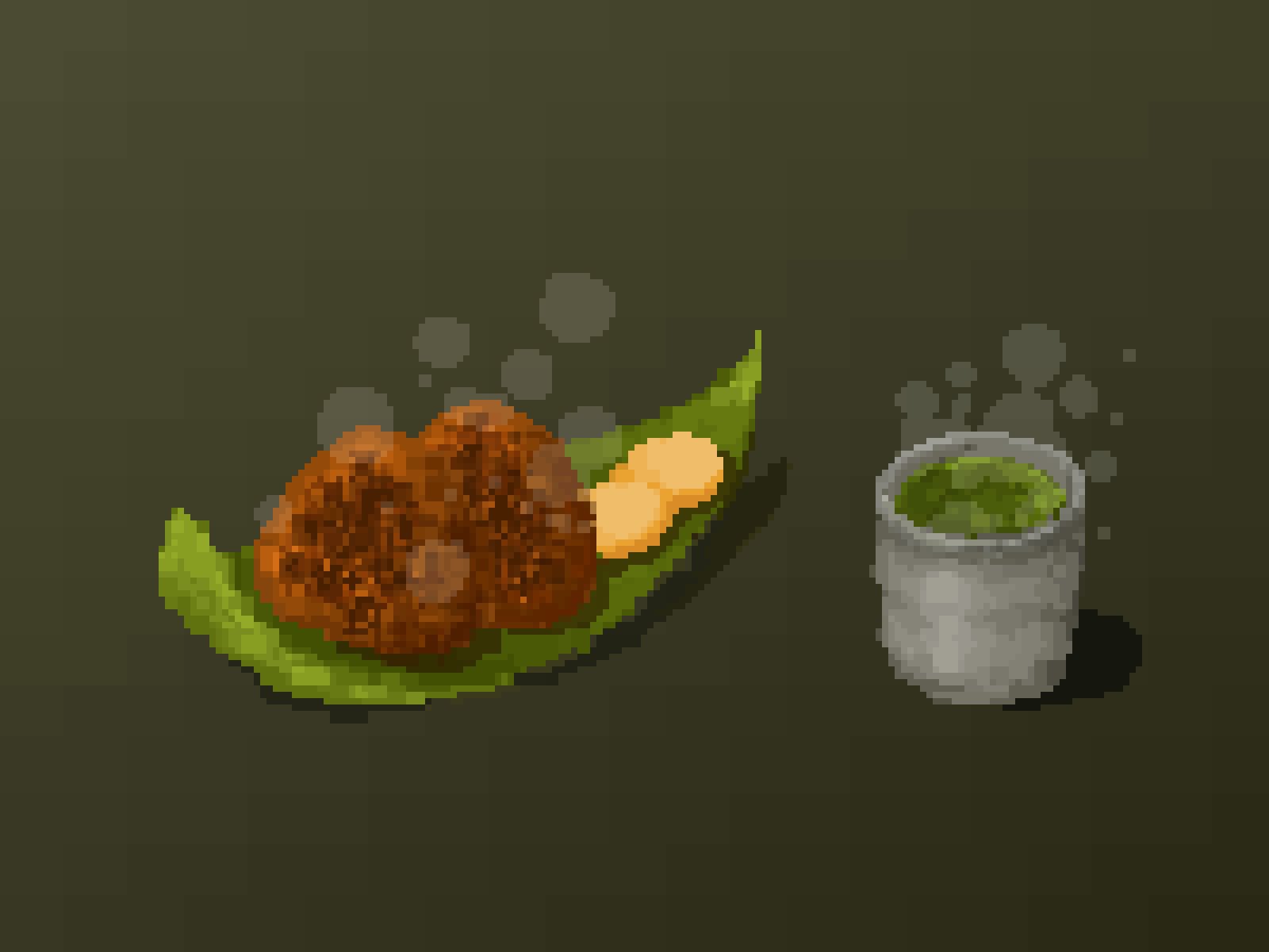 butter cup food food_focus fried_rice green_background green_tea highres hisachan55cute leaf no_humans onigiri original pixel_art scenery simple_background steaming_food sticky_rice tea