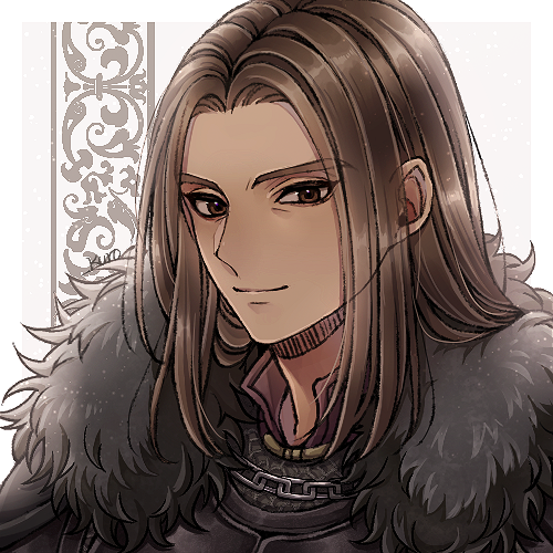 1boy armor brown_eyes brown_hair chain commentary_request dragon_quest dragon_quest_x fur_shawl kuro11_222 long_hair looking_at_viewer looking_to_the_side lowres male_focus mature_male padre_(dq10) parted_hair portrait shawl smile solo white_background