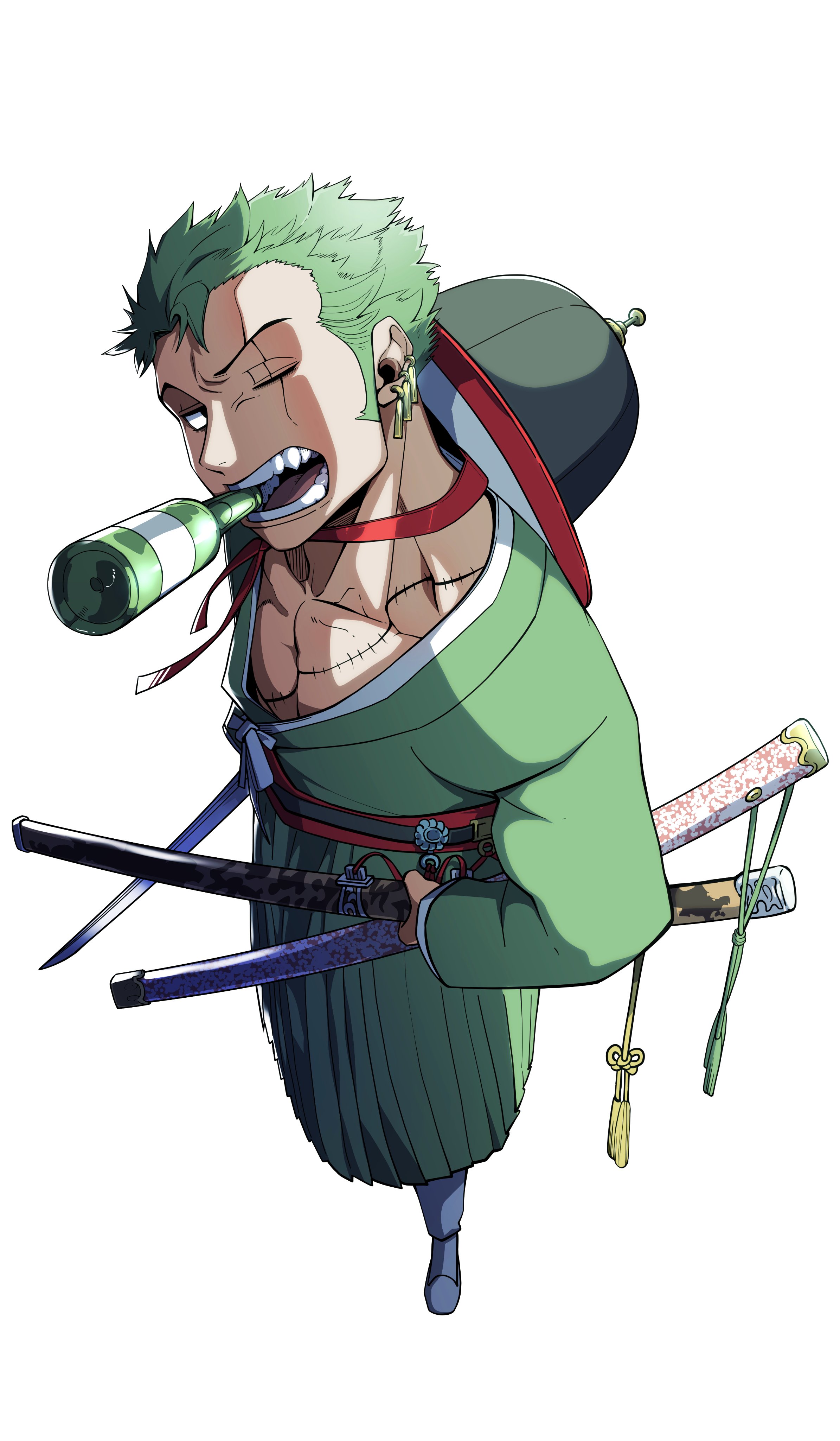 1boy absurdres bottle commentary_request earrings from_above full_body green_hair hanbok hat highres jewelry korean_clothes korean_commentary male_focus one_piece roronoa_zoro sash scar scar_across_eye scar_on_face short_hair sideburns simple_background sjhsh352 solo stitched_torso stitches white_background