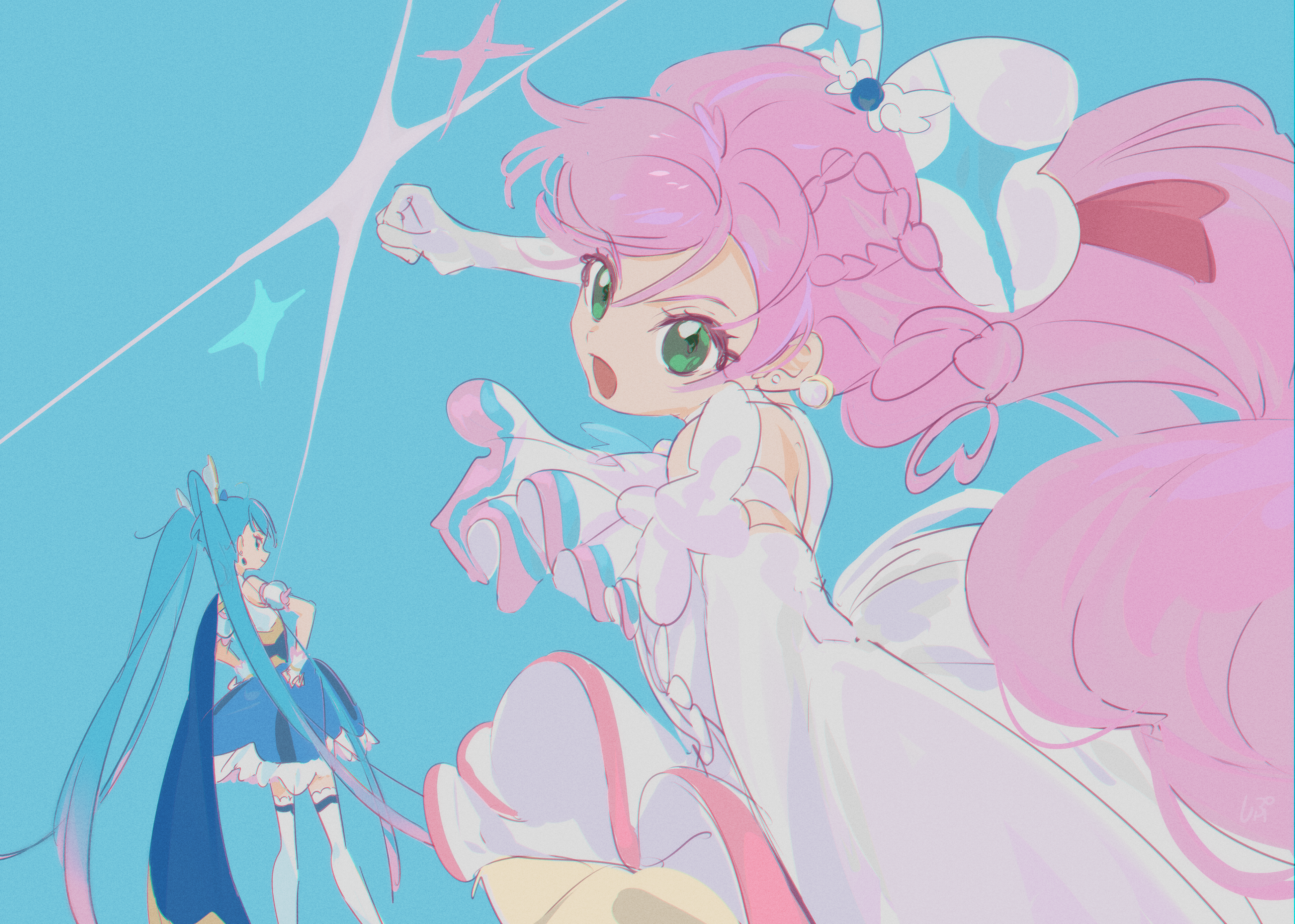2girls absurdres arm_bow armlet ascot blue_background blue_bow blue_cape blue_corset blue_hair blue_skirt bow braid cape clenched_hand closed_mouth corset cowboy_shot cure_prism cure_sky detached_sleeves diamond_print dress earrings elbow_gloves eyelashes feet_out_of_frame floating_earrings floating_hair frilled_skirt frilled_thighhighs frills from_behind gloves gradient_hair green_eyes hair_between_eyes hair_bow hair_ornament half_up_half_down_braid hands_on_own_hips happy heart heart-shaped_hair highres hirogaru_sky!_precure incoming_attack incoming_punch jewelry large_bow long_hair looking_at_another looking_back magical_girl miniskirt multicolored_hair multiple_girls nijigaoka_mashiro open_mouth pink_hair pleated_skirt precure puffy_short_sleeves puffy_sleeves punching shipu_(gassyumaron) shirt short_dress short_sleeves side_braids side_cape simple_background skirt sleeveless sleeveless_shirt smile sora_harewataru sparkle sphere_earrings streaked_hair striped_clothes striped_skirt stud_earrings swept_bangs tareme thighhighs twintails two-tone_hair v-shaped_eyebrows vertical-striped_clothes vertical-striped_skirt very_long_hair white_ascot white_bow white_dress white_gloves white_shirt white_sleeves white_thighhighs white_wrist_cuffs wing_hair_ornament wrist_cuffs yellow_skirt