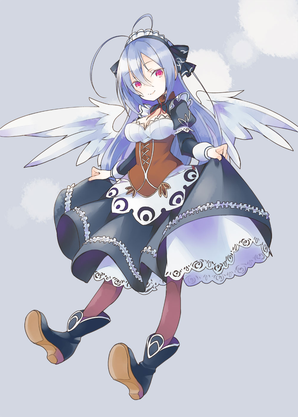 ahoge black_boots black_ribbon black_skirt boots corset emil_chronicle_online frills hair_ribbon highres holding_own_skirt long_hair maid maid_headdress mitama_kyrie pantyhose ribbon simple_background skirt tsukasa_takashi white_hair white_wings wings