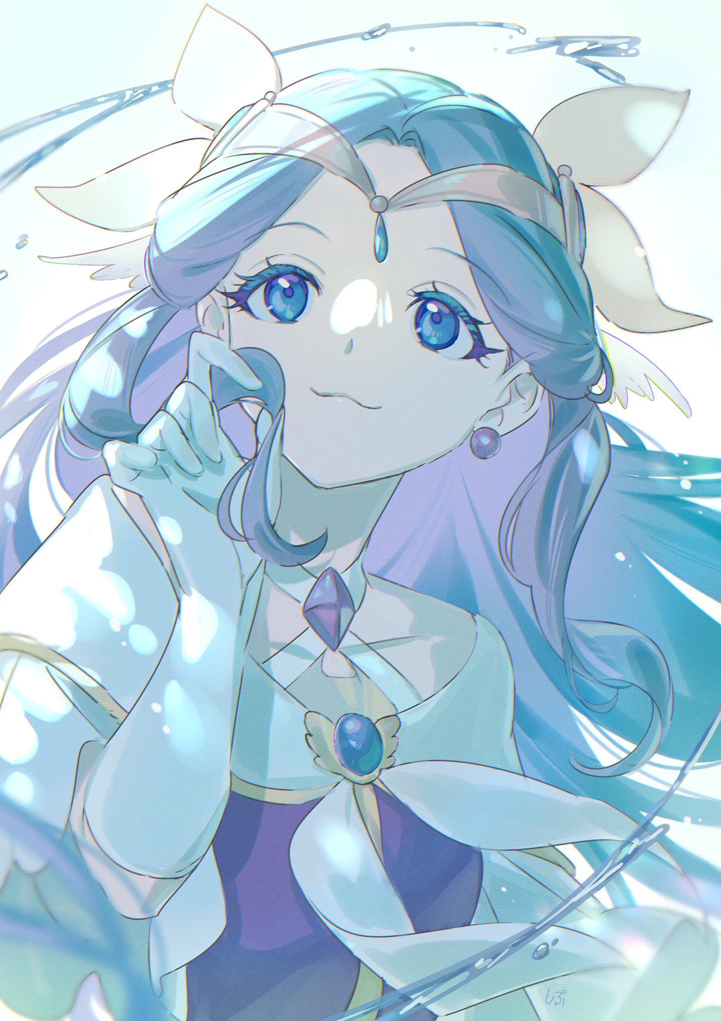 1girl :3 blue_eyes bow brooch circlet closed_mouth collarbone criss-cross_straps cure_earth dot_nose dress earrings eyelashes floating_hair frills fuurin_asumi gloves gold_circlet hair_bow hair_ornament happy healin'_good_precure highres holding holding_own_hair jewelry light_particles long_hair magical_girl neckerchief precure purple_dress purple_hair shipu_(gassyumaron) short_sleeves smile solo sphere_earrings tareme upper_body upturned_eyes very_long_hair water wavy_hair white_background white_bow white_gloves white_neckerchief white_sleeves wing_hair_ornament