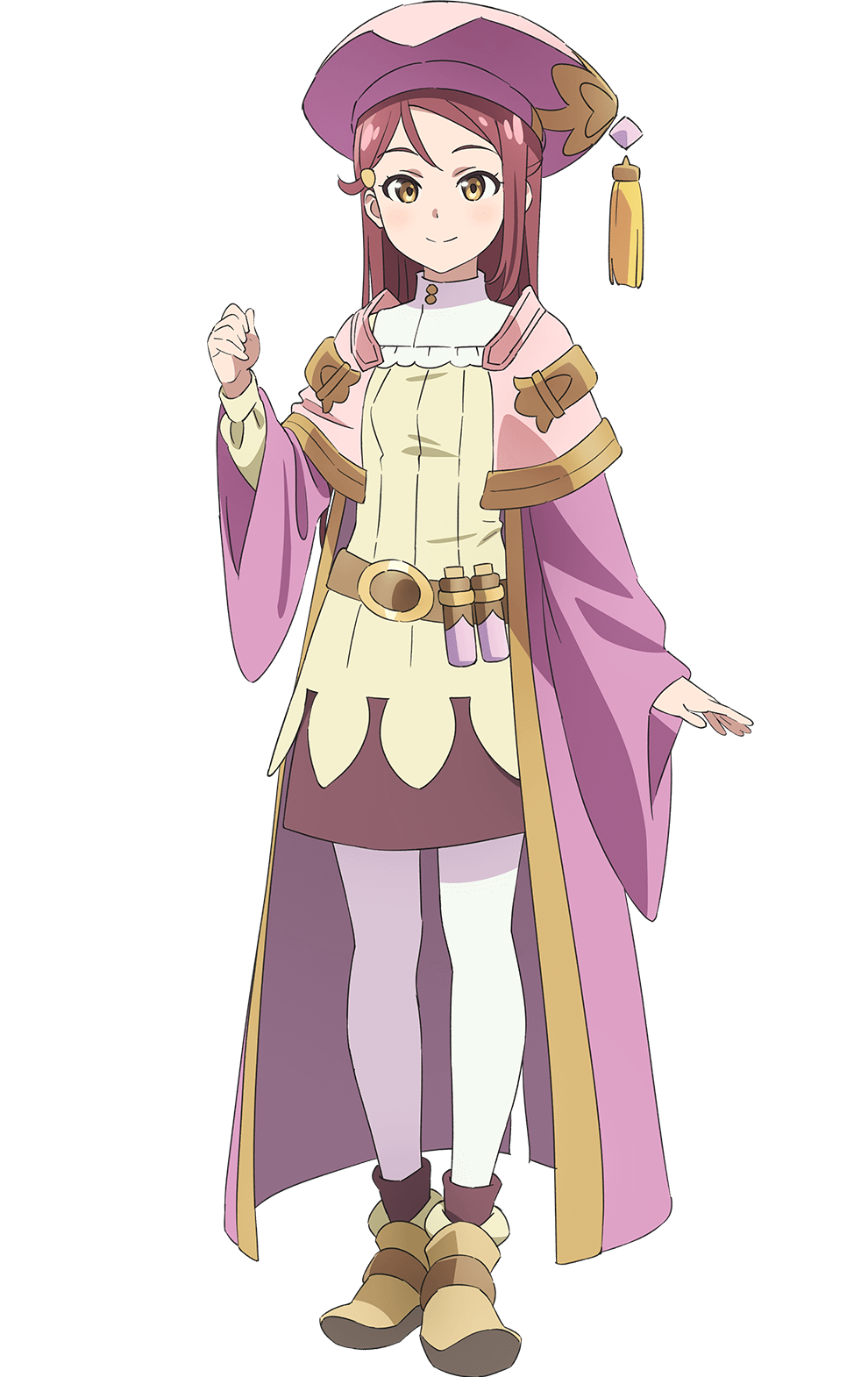 1girl brown_shoes brown_skirt coat full_body genjitsu_no_yohane hair_ornament hairclip half_updo hat hat_tassel highres long_hair long_sleeves love_live! love_live!_sunshine!! miniskirt official_art open_clothes open_coat pantyhose pink_coat pink_hat red_hair riko_(genjitsu_no_yohane) sakurauchi_riko shirt shoes simple_background skirt solo standing tachi-e transparent_background white_pantyhose yellow_eyes yellow_shirt