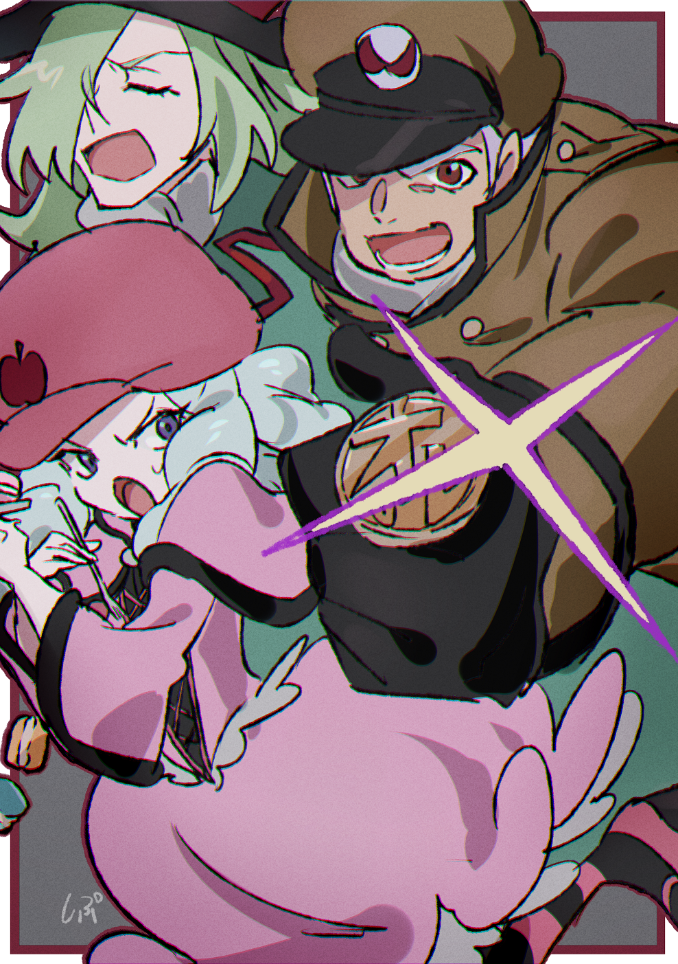 1girl 2boys annoyed black_gloves black_hat black_pantyhose black_sandals blue_eyes border brown_coat brown_eyes brown_hat bubble_skirt buttons capelet closed_eyes coat collared_coat collared_shirt cross-laced_clothes cross-laced_dress double-breasted dress drill_hair food foot_out_of_frame fork frilled_dress frills gloves green_coat green_hair grey_background grey_hair hair_over_one_eye happinesscharge_precure! happy hat high_collar highres holding holding_fork holding_medal hosshiwa lapels long_hair long_sleeves looking_at_viewer lower_teeth_only macaron medium_dress military_hat military_uniform multiple_boys muscular muscular_male namakeruda newsboy_cap notched_lapels old old_man open_mouth oresky outside_border outstretched_arm pantyhose peaked_cap pink_capelet pink_dress pink_hat pink_pantyhose platform_sandals precure sandals shipu_(gassyumaron) shirt short_hair signature skirt smile sparkle striped_clothes striped_pantyhose sweatdrop teeth thick_eyebrows two-tone_pantyhose v-shaped_eyebrows white_border white_hair white_shirt