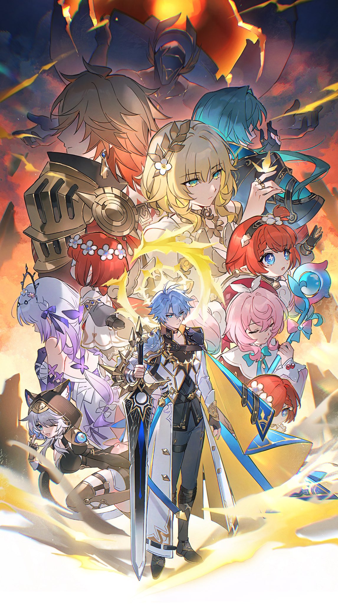3boys 6+girls aglaea_(honkai:_star_rail) anaxa_(honkai:_star_rail) animal_ears antenna_hair aqua_eyes aqua_hair armor back_tattoo black_choker black_coat black_gloves black_pants black_shirt blonde_hair blue_cape blue_eyes bug butterfly cape castorice_(honkai:_star_rail) cat_ears cat_girl choker cipher_(honkai:_star_rail) coat commentary dress fingerless_gloves gloves gradient_hair halo halo_behind_head hat highres holding holding_sword holding_weapon honkai:_star_rail honkai_(series) hood hood_up hyacine_(honkai:_star_rail) insect kephale_(honkai:_star_rail) laurel_crown long_hair medium_hair multicolored_hair multiple_boys multiple_girls mydei_(honkai:_star_rail) open_clothes open_coat osamu18568716 pants parted_bangs pauldrons phainon_(honkai:_star_rail) pink_hair purple_hair red_hair red_hat red_tattoo shirt short_hair shoulder_armor single_glove single_pauldron sword tattoo thigh_strap tiara trianne_(honkai:_star_rail) tribbie_(honkai:_star_rail) trinnon_(honkai:_star_rail) weapon white_coat white_dress white_hair yellow_butterfly yellow_halo