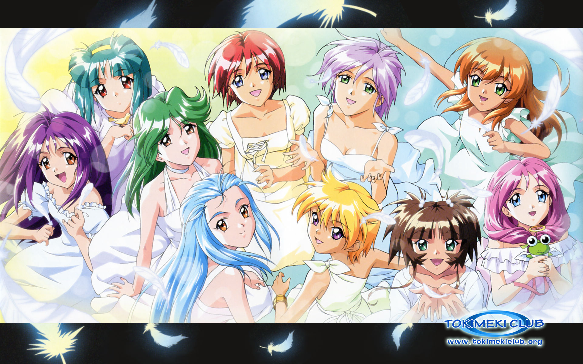6+girls akai_homura alternate_costume asou_kasumi bare_shoulders blonde_hair blue_eyes blue_hair brown_hair closed_mouth collarbone dress feathers feet_out_of_frame female_focus green_eyes green_hair hair_between_eyes headband highres hinomoto_hikari holding ijuuin_mei kotobuki_miyuki kudanshita_maeka long_hair looking_at_viewer minazuki_kotoko multiple_girls official_art open_mouth orange_hair purple_eyes purple_hair red_hair sakura_kaedeko shirayuki_miho short_hair short_sleeves sleeveless stuffed_toy tokimeki_memorial tokimeki_memorial_2 watermark web_address white_dress yae_kaori yellow_headband