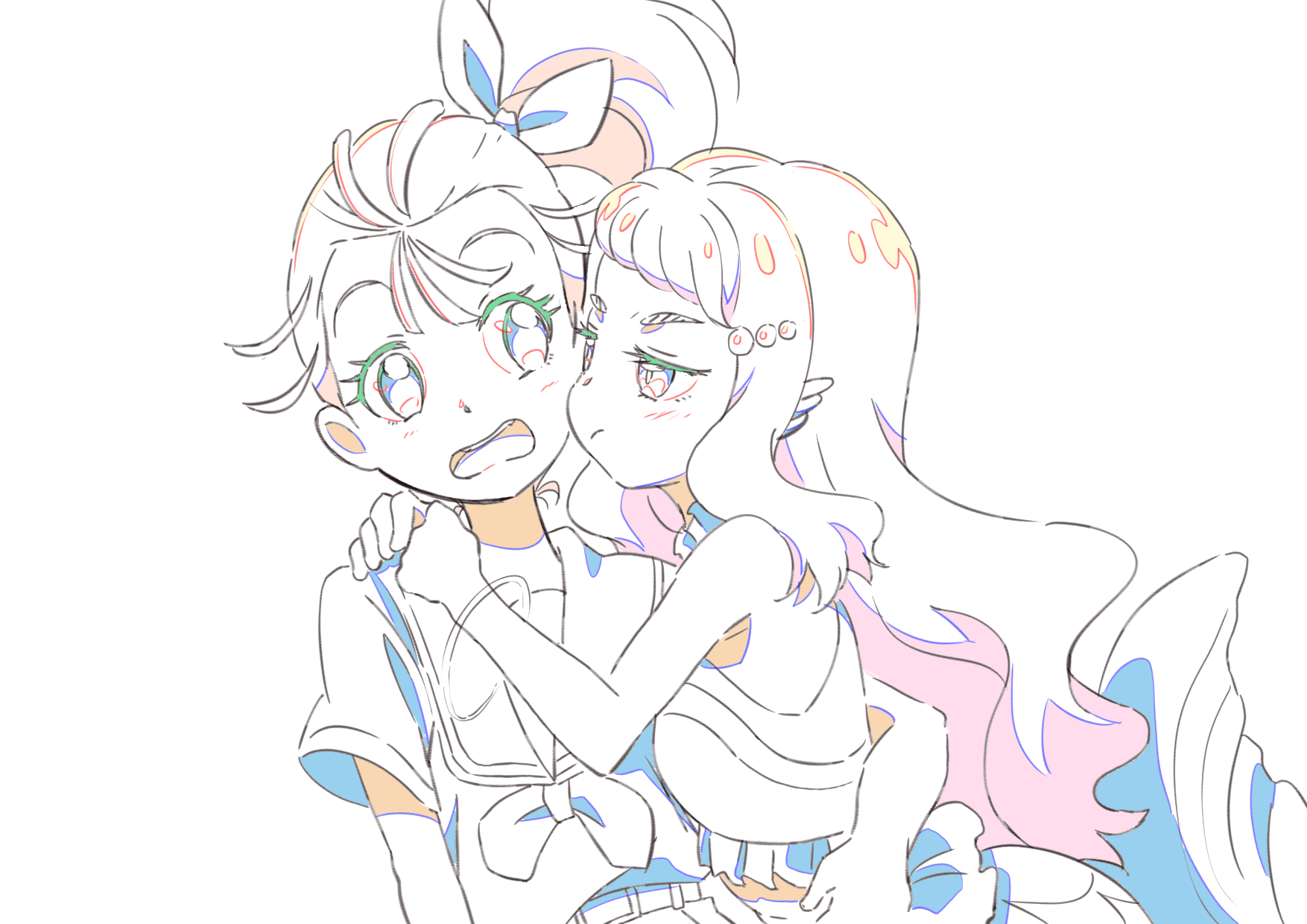 2girls aozora_middle_school_uniform arm_around_another's_waist arms_around_neck bare_arms bare_shoulders beads belt belt_buckle blue_eyes blunt_bangs bow bracelet brown_hair buckle closed_mouth color_trace colored_eyelashes commentary_request cowboy_shot crop_top dot_nose fins fish_tail flustered frilled_shirt frills frown fun_(gary22718) furrowed_brow hair_beads hair_bow hair_ornament hairclip head_fins heads_together high_side_ponytail highres hug jealous jewelry laura_la_mer laura_la_mer_(mermaid) light_blush long_hair merfolk mermaid midriff monster_girl multiple_girls natsuumi_manatsu neckerchief open_mouth partially_colored pink_eyes pink_hair pleated_skirt ponytail pout precure sailor_collar school_uniform serafuku shirt short_hair short_ponytail short_sleeves side_ponytail simple_background skirt sleeveless sleeveless_shirt tail tareme teeth thick_eyebrows tropical-rouge!_precure upper_teeth_only very_long_hair wavy_hair white_background white_bow yuri