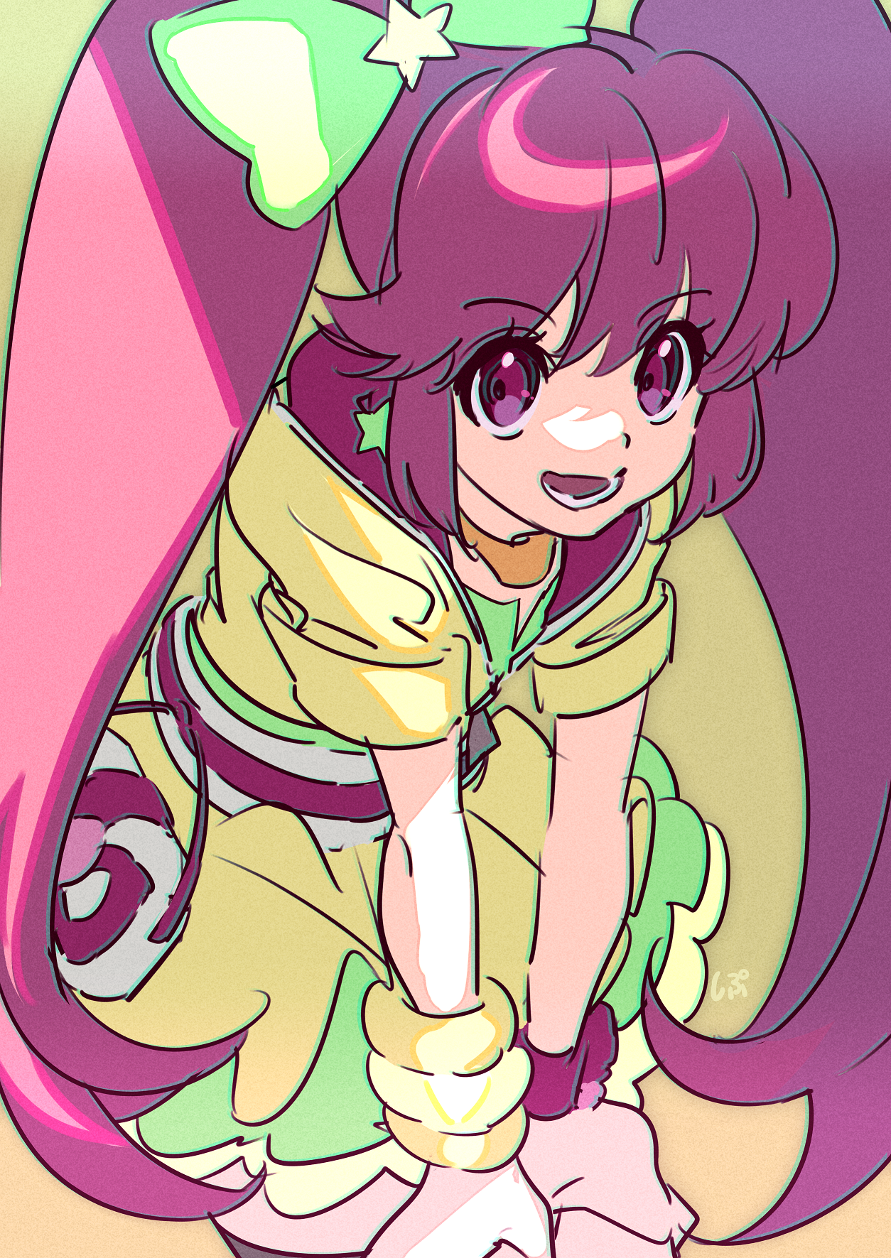 1girl aino_megumi bow cowboy_shot cure_lovely cure_lovely_(lollipop_hip_hop) dress earrings eyelashes frilled_skirt frills gold_necklace green_background green_bow green_skirt hair_between_eyes hair_bow hair_ornament hands_on_own_thighs happinesscharge_precure! happy heart highres hood hood_down hooded_dress jewelry leaning_forward long_hair lower_teeth_only magical_girl miniskirt necklace official_alternate_costume open_mouth pink_eyes pink_hair pink_hood pleated_skirt precure shipu_(gassyumaron) short_dress short_sleeves simple_background skirt skirt_under_dress sleeve_cuffs smile solo star_(symbol) star_earrings star_hair_ornament tareme teeth twintails very_long_hair waist_bag watch white_bag wristband wristwatch yellow_dress zipper_pull_tab