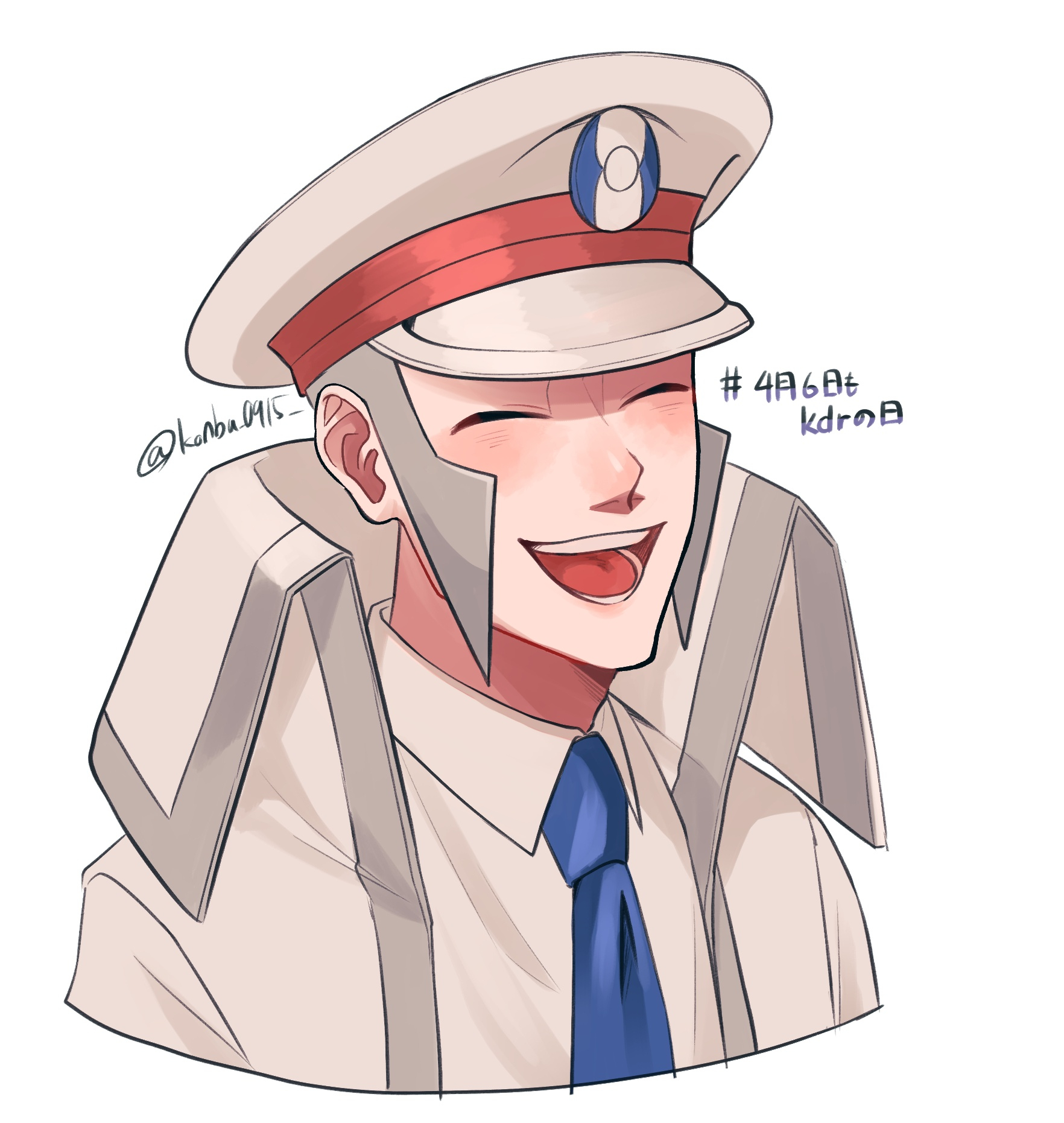 1boy blue_necktie coat collared_shirt cropped_torso emmet_(pokemon) happy hat high_collar highres konbu_0915 long_sideburns male_focus necktie nintendo pokemon pokemon_black_and_white shirt sideburns simple_background translation_request white_background white_coat white_hat white_shirt