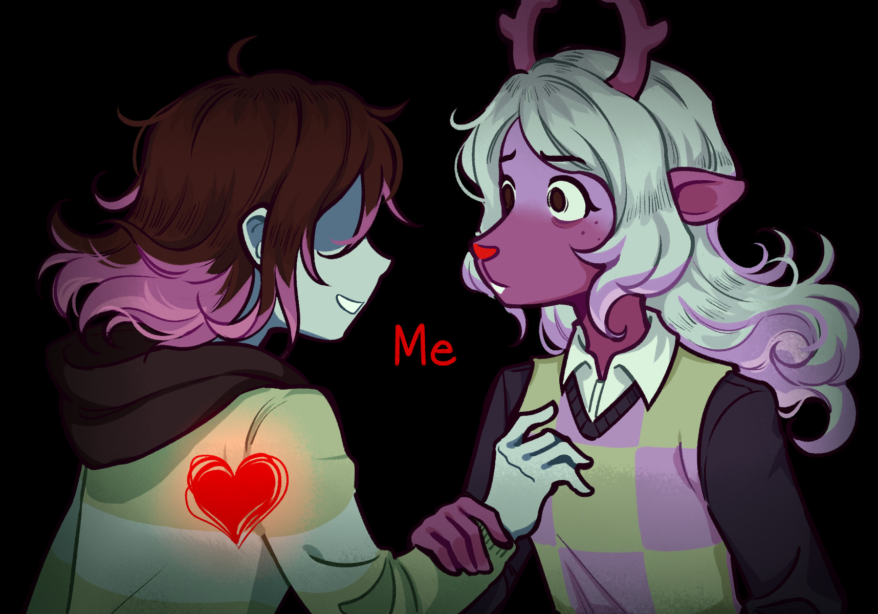1girl 1other animal_ears antlers blonde_hair brown_hair colored_skin deer_antlers deer_ears deer_girl deltarune drawthiere furry furry_female heart highres horns kris_(deltarune) long_hair long_sleeves noelle_holiday noelle_holiday_(dark_world) possessed reindeer_girl shirt soul_(deltarune) teeth utdr_(toby_fox) vessel_(deltarune) weird_route_(deltarune)