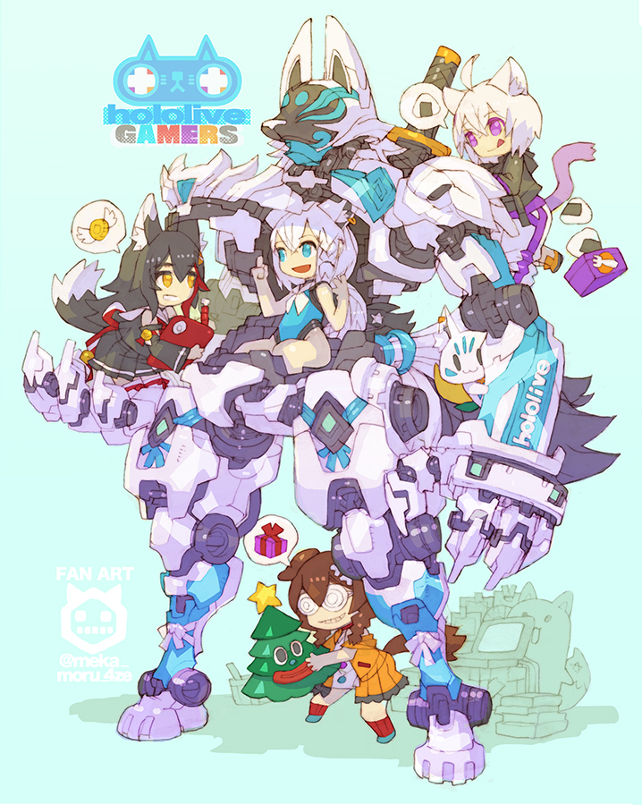 4girls animal_ears black_hoodie black_shirt black_skirt braid chibi coke-bottle_glasses commentary_request dog_ears dog_girl dog_tail english_text engrish_text food fox_ears fox_girl glasses hololive hololive_gamers hood hoodie humanoid_robot inugami_korone jacket leotard long_hair mecha medium_hair miniskirt multiple_girls nakayama_tooru nekomata_okayu onigiri ookami_mio orange_jacket orange_skirt pleated_skirt ponytail purple_eyes purple_hair ranguage robot round_eyewear shirakami_fubuki shirt short_hair side_braids skirt sukonbu_(shirakami_fubuki) tail tongue tongue_out tree-kun_(inugami_korone) virtual_youtuber white_hair white_leotard white_shirt wolf_ears wolf_girl wolf_tail