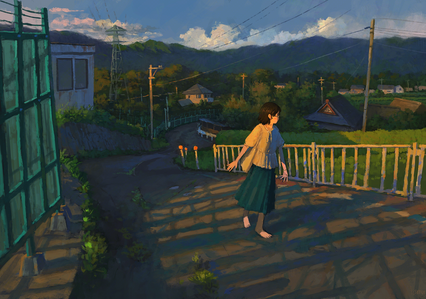 1girl barefoot black_hair blue_skirt blush commentary_request evening fjsmu forest glasses highres house mountainous_horizon nature original outdoors power_lines road rural scenery shirt short_hair skirt solo summer sunset utility_pole vanishing_point walking white_shirt