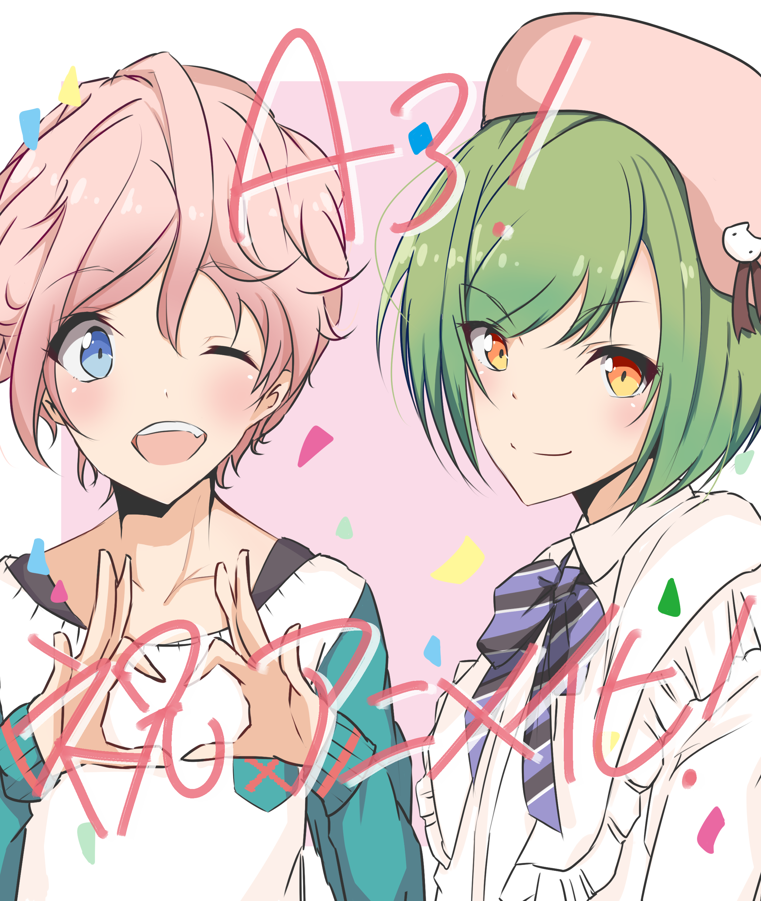 2boys a3! absurdres androgynous bishounen blue_eyes blush bow bowtie closed_mouth collarbone confetti green_hair hat heart heart_hands highres higi_ni_bo long_sleeves looking_at_viewer messy_hair multiple_boys one_eye_closed open_mouth orange_eyes pink_background pink_hair rurikawa_yuki sakisaka_muku short_hair smile striped_bow striped_bowtie striped_clothes sweater teeth upper_body upper_teeth_only