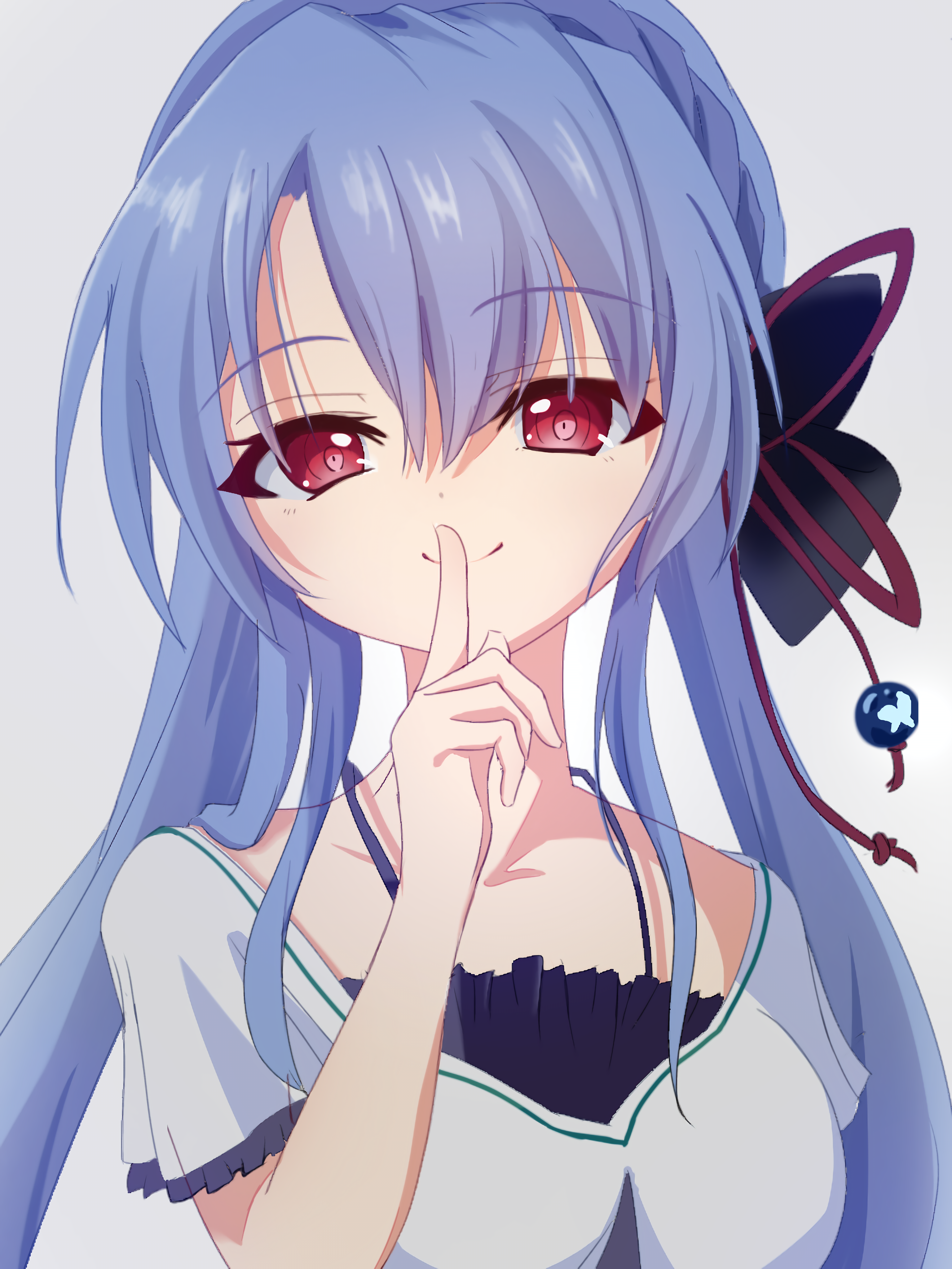 1girl absurdres black_bow blue_hair bow braid breasts casual closed_mouth commentary crown_braid eyes_visible_through_hair finger_to_mouth frilled_sleeves frills grey_background hair_between_eyes hair_bow hair_ribbon hand_up highres index_finger_raised long_hair looking_at_viewer medium_breasts red_eyes red_ribbon ribbon ringed_eyes shirt short_sleeves shushing sidelocks simple_background smile solo sorakado_ao split_mouth summer_pockets upper_body wataame_(jvdy4345) white_shirt
