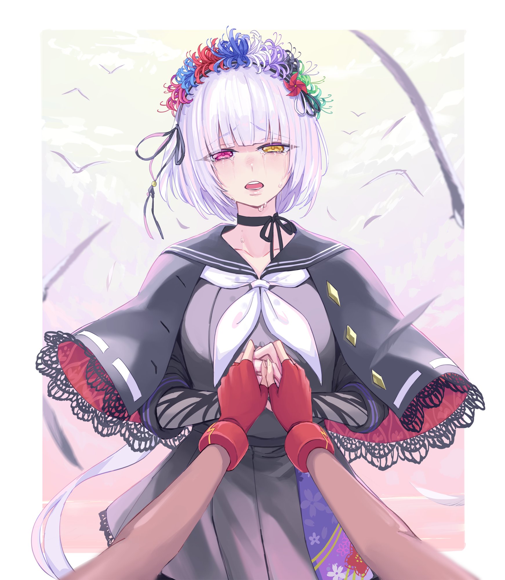 2girls assault_lily bird black_capelet black_cardigan black_choker black_gloves black_hairband black_ribbon black_sailor_collar black_serafuku black_shirt black_skirt blue_flower blunt_bangs blush border bow_hairband brown_gloves buttons capelet cardigan choker cloud commentary_request cowboy_shot crying crying_with_eyes_open day elbow_gloves falling_feathers feathers female_pov fingerless_gloves floral_print flower flower_wreath gloves gradient_sky green_flower hair_ribbon hairband half-closed_eyes hands_up head_wreath heterochromia highres holding_hands kondou_misaka lace lace-trimmed_capelet lace-trimmed_skirt lace_trim long_hair long_sleeves looking_at_viewer low_ponytail mila_(yuta27315) miniskirt multiple_girls neck_ribbon neckerchief nose_blush open_cardigan open_clothes open_mouth outdoors outside_border own_hands_clasped own_hands_together pink_eyes pink_sky pleated_skirt ponytail pov pov_hands print_skirt purple_flower purple_sky raised_eyebrows red_capelet red_flower ribbon ribbon_choker sailor_collar school_uniform serafuku shirt skirt sky standing tears three-quarter_sleeves two-sided_capelet two-tone_gloves very_long_hair white_border white_flower white_neckerchief yamaguchi_chihiro_(assault_lily) yellow_eyes yellow_sky
