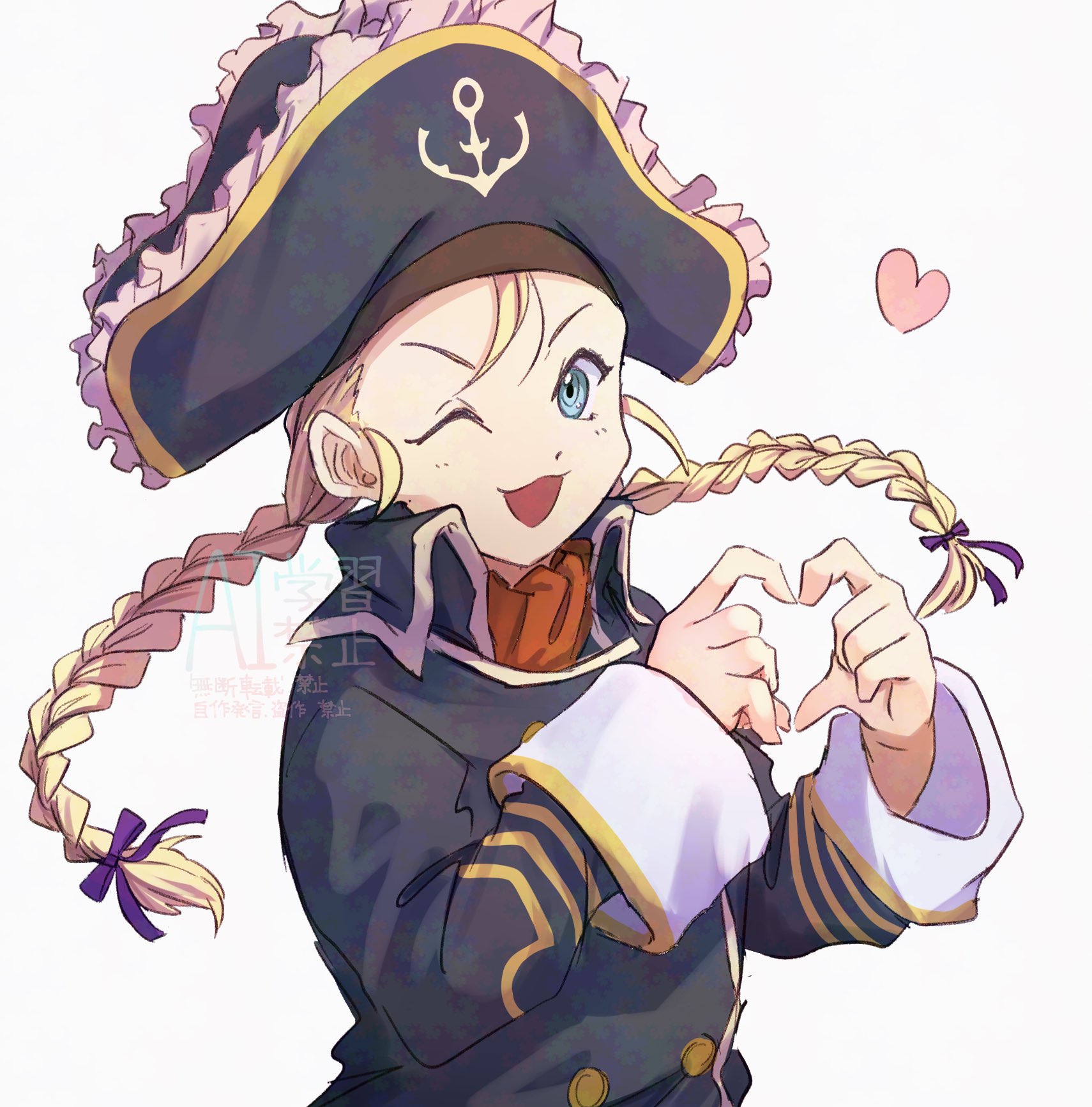 1girl blonde_hair blue_eyes braid braided_twintails commentary_request hat heart heart_hands highres long_hair looking_at_viewer low-tied_long_hair low_twintails one_eye_closed open_mouth patty_fleur pery_618 pirate_hat simple_background smile solo tales_of_(series) tales_of_vesperia twintails upper_body watermark white_background