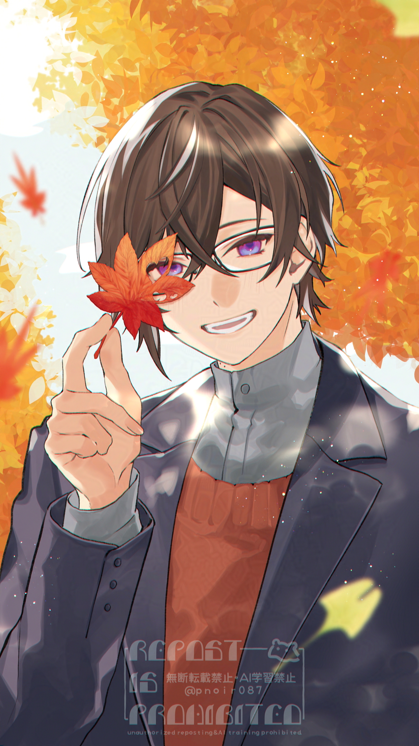 1boy :d absurdres artist_name autumn autumn_leaves black-framed_eyewear black_hair black_jacket blue_eyes blue_sky cloud commentary crossed_bangs day falling_leaves ginkgo_leaf glasses grey_shirt hair_between_eyes hand_up highres holding holding_leaf jacket kaburagi_(pnoir087) lapels leaf long_sleeves looking_at_viewer male_focus maple_leaf mole mole_on_neck multicolored_eyes nijisanji open_clothes open_jacket open_mouth outdoors purple_eyes red_sweater shikinagi_akira shirt short_hair sky smile solo sweater untranslatable_commentary teeth tree twitter_username upper_body virtual_youtuber watermark