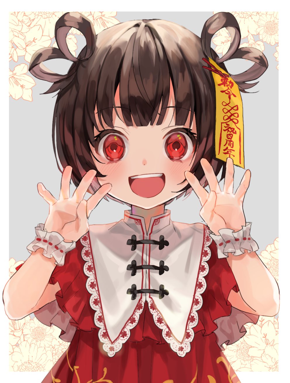 1girl :d black_hair border capelet child chinese_clothes commentary_request dress flower frilled_capelet frilled_wristband frills hair_rings hand_up highres jiangshi kuroda_(kuro_yyy) lace-trimmed_capelet lace_trim looking_at_viewer mandarin_collar number_four_(asl) ofuda open_mouth original outside_border pink_flower quad_hair_rings red_capelet red_dress red_eyes rei_(kuroda_(kuro_yyy)) short_hair smile solo teeth translated upper_body upper_teeth_only white_border white_capelet wristband