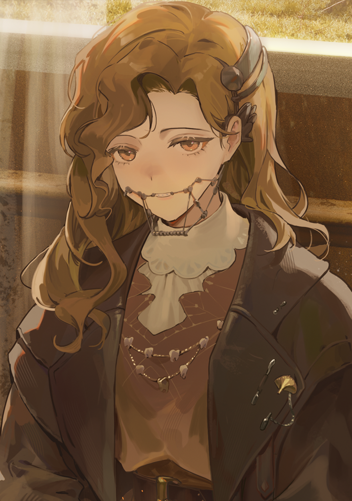 1girl braces brown_coat brown_eyes brown_hair cccc2445 coat cropped curtains dress indoors jewelry looking_at_viewer necklace red_dress reverse:1999 solo tooth_fairy_(reverse:1999) tooth_necklace upper_body