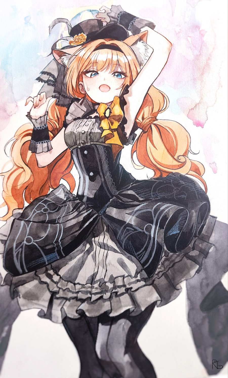 1girl :o animal_ear_fluff animal_ears arm_up armpits black_dress black_hairband black_hat black_pantyhose blue_archive blue_eyes blush bow cat_ears cat_girl center_frills commentary dress dress_bow extra_ears eyelashes feet_out_of_frame flower fluffy_hair frilled_dress frills gangbyeon grey_dress hair_between_eyes hair_intakes hairband hand_up hat hat_feather hat_flower highres idol idol_clothes korean_commentary long_hair looking_at_viewer low_twintails mari_(blue_archive) mari_(idol)_(blue_archive) official_alternate_costume official_alternate_hairstyle open_mouth orange_hair painting_(medium) pantyhose rose signature simple_background sleeveless sleeveless_dress solo standing sweatdrop top_hat traditional_media tsurime twintails two-tone_dress watercolor_(medium) white_background yellow_bow yellow_flower yellow_rose