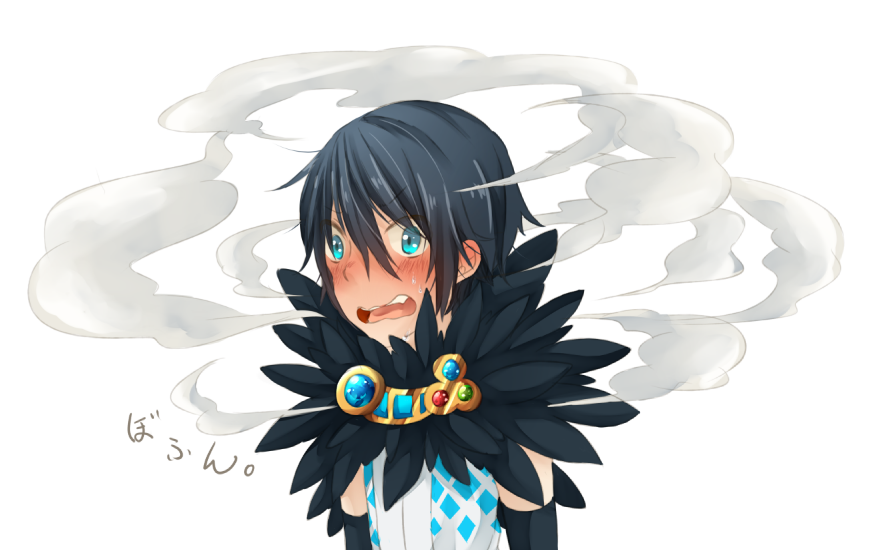 1boy argyle_clothes argyle_shirt black_hair blue_eyes blush commentary_request fur_collar hair_between_eyes head_steam long_bangs looking_at_viewer male_focus meiko_(nattu303) nose_blush open_mouth ragnarok_online shirt simple_background solo sorcerer_(ragnarok_online) v-shaped_eyebrows white_background white_shirt