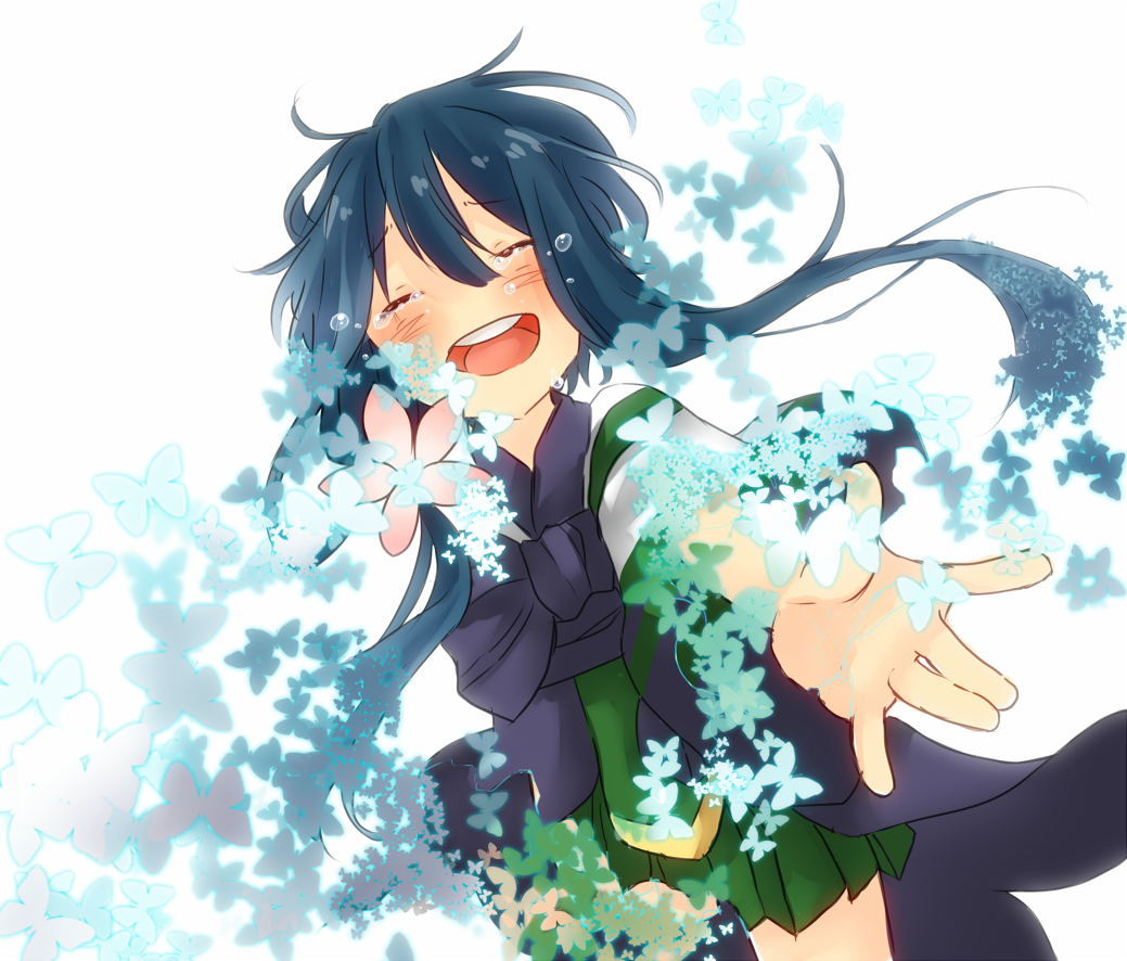 1girl alternate_color blue_butterfly blue_hair blush bow bug butterfly closed_eyes commentary_request cowboy_shot crying green_skirt grey_bow hanbok insect korean_clothes long_hair meiko_(nattu303) open_mouth ragnarok_online shirt simple_background skirt smile solo soul_linker_(ragnarok_online) white_background white_shirt