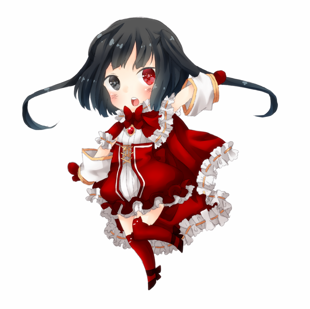 1girl black_eyes black_hair blush bow bowtie cape chibi chibi_only commentary_request dress full_body heterochromia looking_at_viewer meiko_(nattu303) mittens open_mouth ragnarok_online red_bow red_bowtie red_cape red_eyes red_mittens red_thighhighs ribbon-trimmed_cape short_hair simple_background smile solo standing standing_on_one_leg thighhighs warlock_(ragnarok_online) white_background white_dress